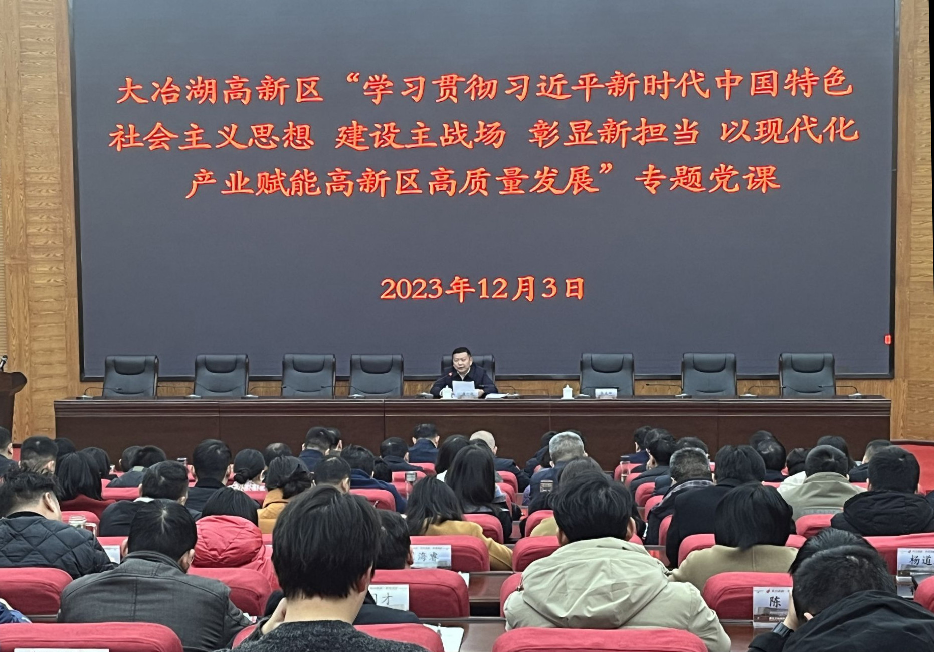 云上大冶报道(记者 冯鑫)12月3日,市委副书记、高新区党工委书记潘小进以“学习贯彻习近平新时代中国特色社会主义思想,建设主战场、彰显新担当、以现代化产业赋能高新区高质量发展”为题,从深刻领会习近平总书记关于建设现代化产业体系的重要论述、精准把握高新区产业发展的现状和问题、以现代化产业赋能高新区高质量发展三方面,为高新区党工委班子成员、各内设机构及企事业单位班子成员、退休党员代表、园区重点企业党组织书记等讲授专题党课。