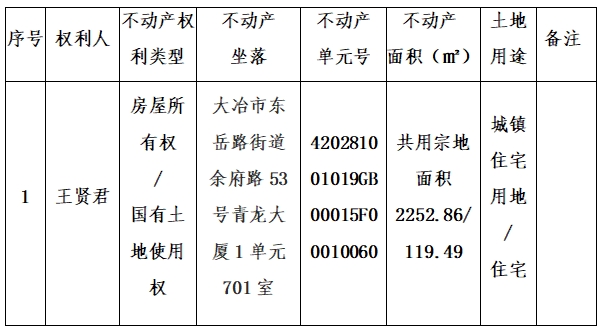 王贤君对坐落于大冶市东岳路街道余府路53号青龙大厦1单元701室房屋申请登记,因开发商失联,无法在不动产登记申请书中申请人(义务人)栏签章,现根据《不动产登记暂行条例》、《不动产登记暂行条例实施细则》、《不动产登记操作规范(试行)》之规定,我中心对该申请予以审查并予公告。如对所述内容有异议,请自本公告之日起十五个工作日内将异议书面材料送达大冶市不动产登记中心综合窗口。逾期无人提出异议或者异议不成立的,我机构将予以登记并颁发不动产权证书。