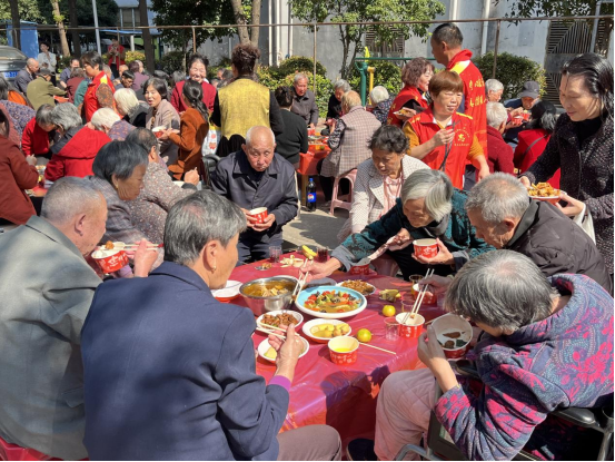 “开饭啦!”李三保一声吆喝,红烧肉、粉蒸肉、烧猪脚等一道道菜陆续上桌。在场吃饭的老人大多年过七十,不少是子女用轮椅推着来的。对他们而言,这不只是一顿饭,更是和“家人”团聚的时刻。李三保说,有些老人已经搬去和儿女同住,可一接到邀请电话,都忍不住感慨:“这顿和‘家里人’一起吃的饭,一定回来。”