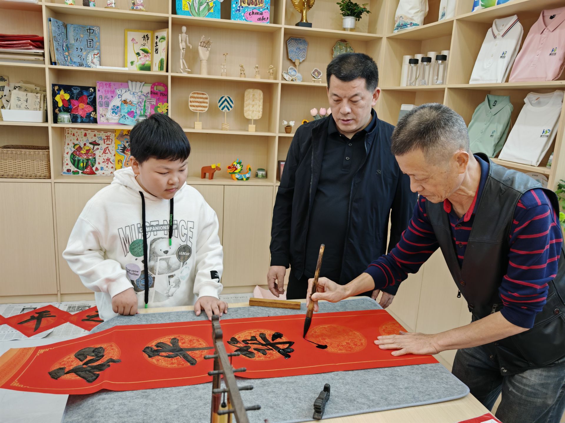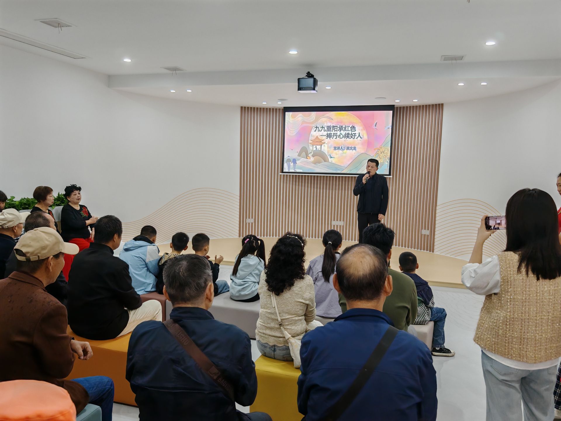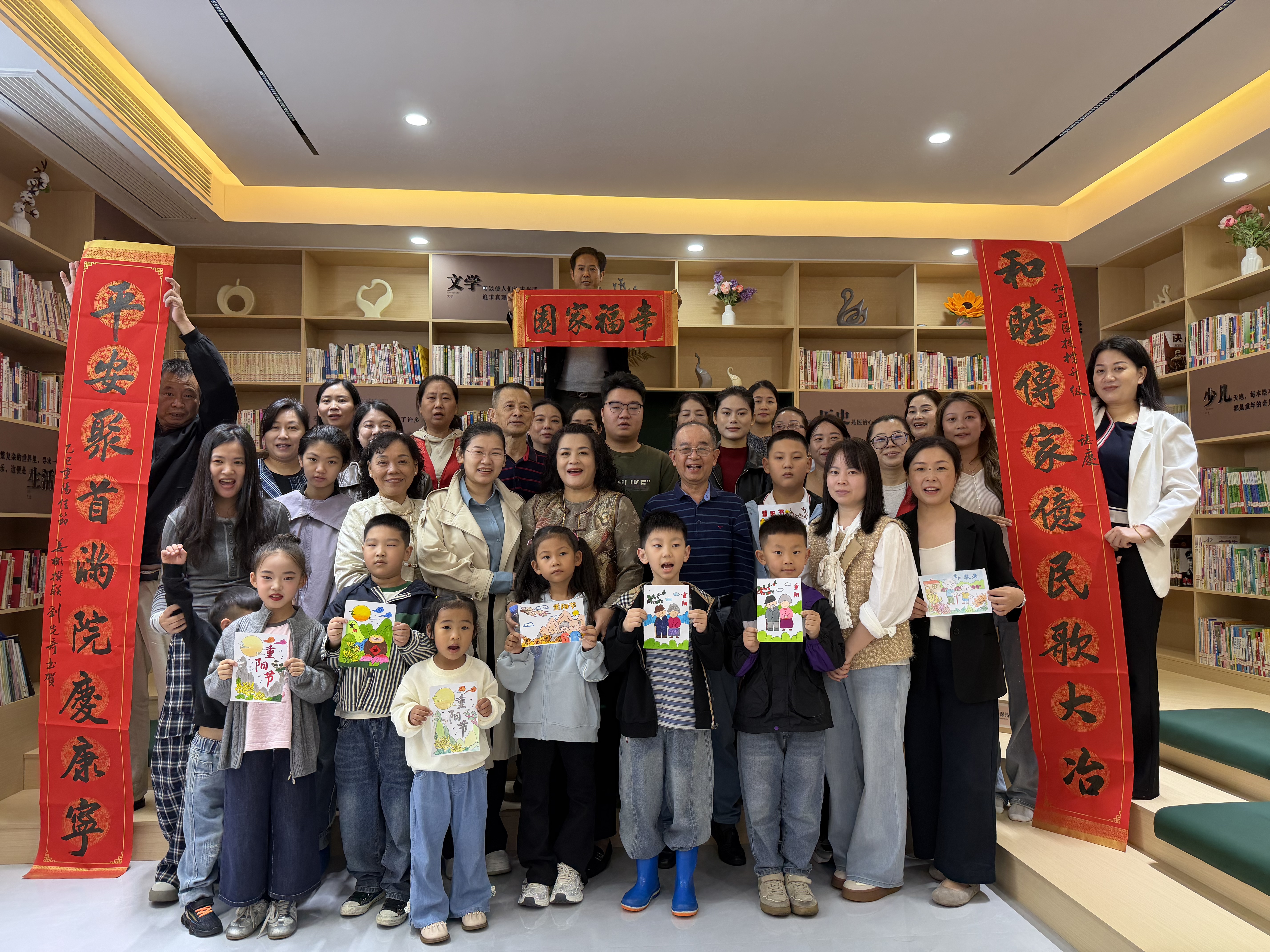活动现场,书法爱好者刘先奇挥毫写下“重阳敬老”作品,孩子们手绘菊花、现做糕点送上祝福;儿童为老人献贺卡、递菊花茶,老幼结对参观功能区,老人讲述社区变迁,儿童分享喜爱的活动区域;社区志愿者与孩子们共读《重阳节的传说》,详解“插茱萸”等传统习俗;“中国好人”龚文龙分享敬老故事,老年舞蹈、儿童拉丁舞轮番上演,大合唱《没有共产党就没有新中国》将活动气氛推向高潮。