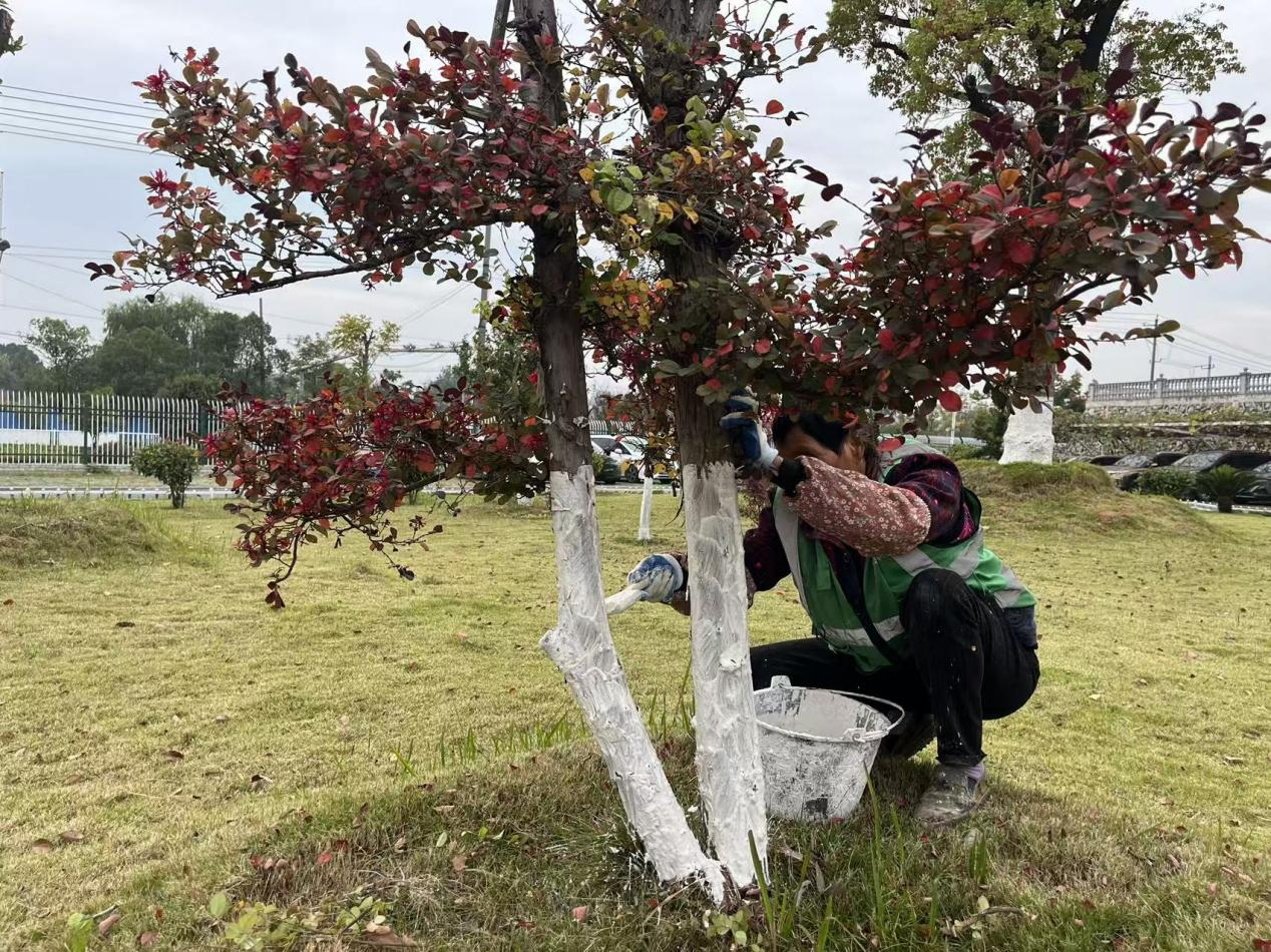 为确保刷白工作质量,该中心安排专业人员结合园区树木种类、树龄及生长状况,制定了详细实施方案,严格按照规范标准配置涂白剂,既确保防冻防虫效果,又避免对土壤和植被造成污染。作业过程中,工人们严格按照“统一高度、均匀涂抹”标准,使用毛刷对树木根部以上1.2米树干进行细致涂刷,同时仔细清理树干周围枯枝落叶,排查病虫害隐患。