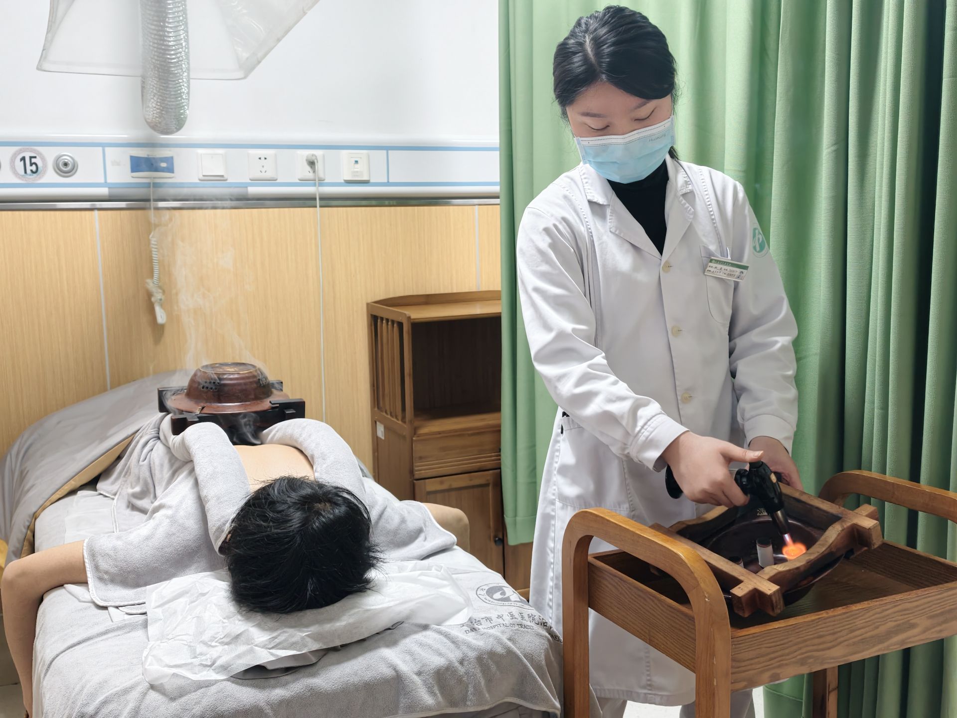 治疗室内弥漫着艾绒的药香,医生们将点燃的艾炷放置在患者背部穴位上,随着艾热持续渗透,患者神情逐渐放松,静静感受着三九灸沿经络传递的温阳之力。