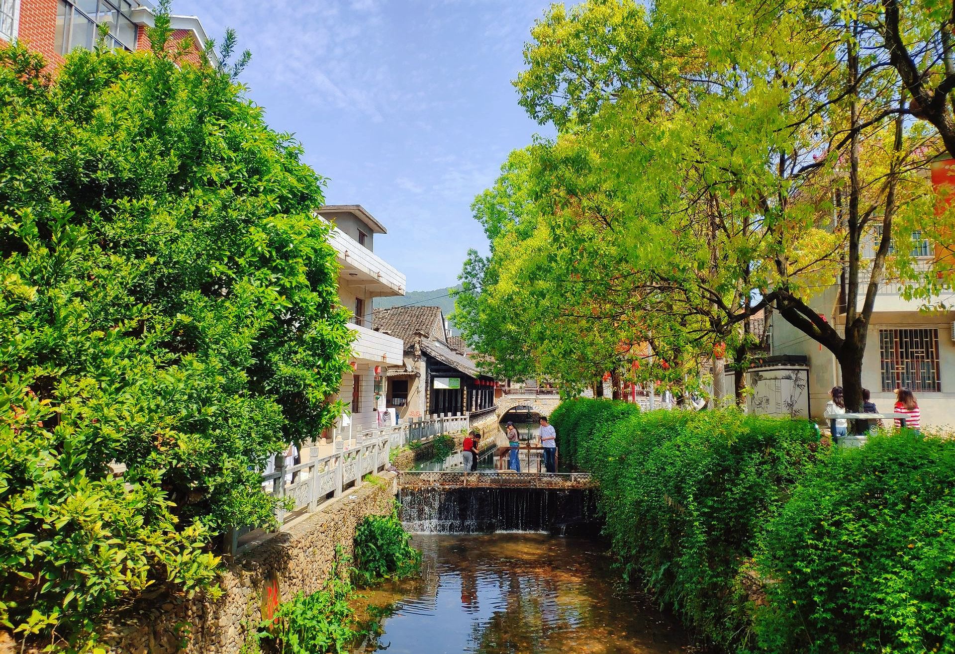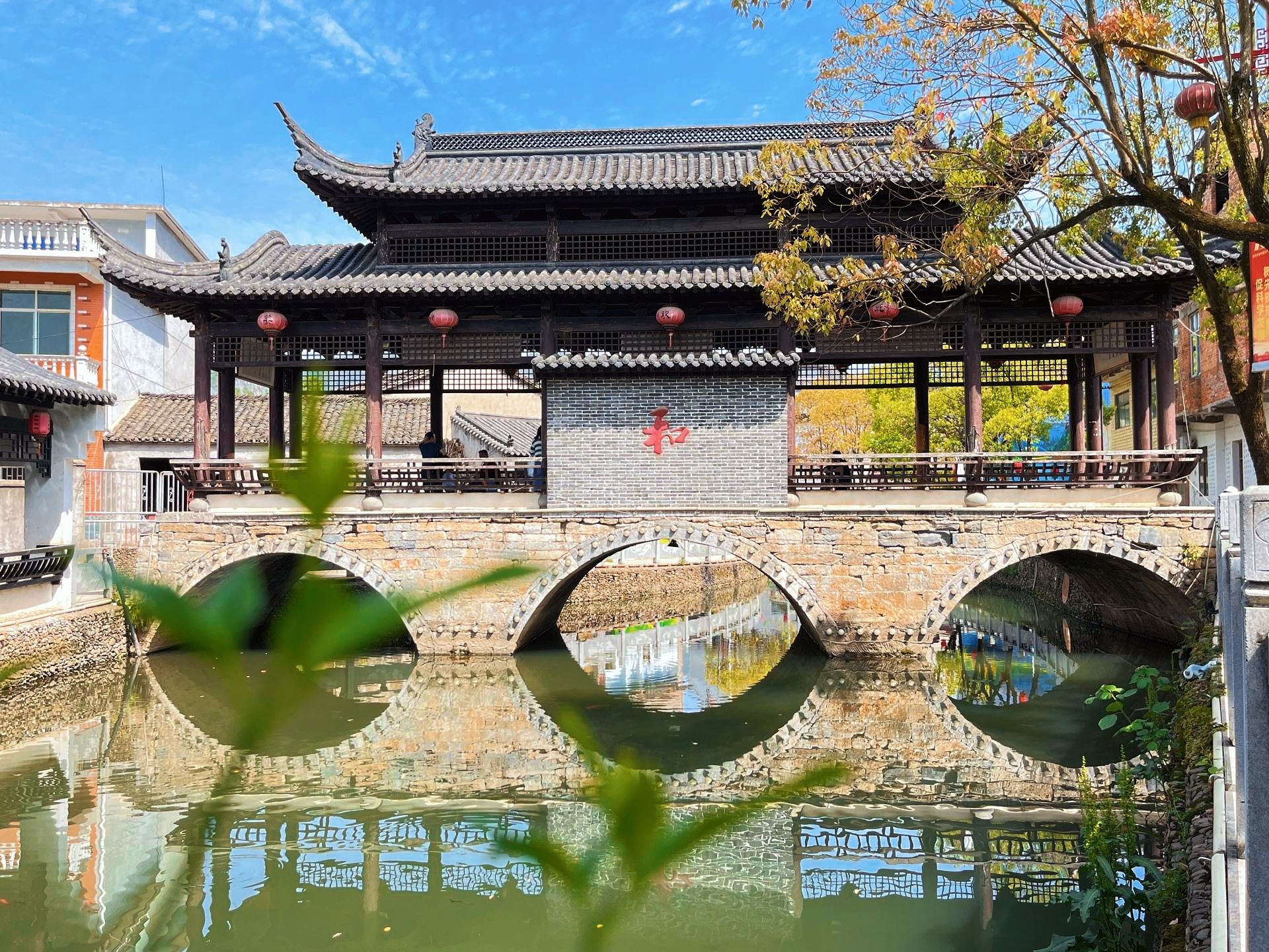两岸的樟树与垂柳褪去了浓绿,叶片染上浅黄,微风拂过,细碎的落叶簌簌飘落在水面上,顺着溪流缓缓流淌。赣派民居鳞次栉比地依偎在河岸两侧,青砖白墙在晴空下格外清丽;马头墙翘角飞檐,倒映在水中,构成一幅“小桥流水人家”的绝美画卷,让人恍惚间误入了江南秘境。