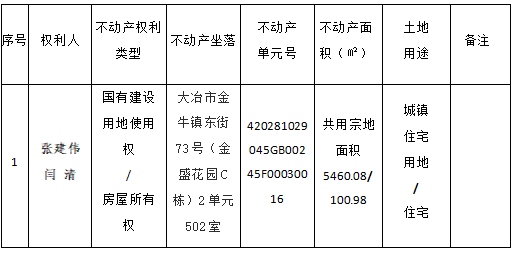 张建伟、闫清对坐落于大冶市金牛镇东街73号(金盛花园C栋)2单元502室申请登记,因开发商失联,无法在不动产登记申请书中申请人(义务人)栏签章,现根据《不动产登记暂行条例》、《不动产登记暂行条例实施细则》、《不动产登记操作规范(试行)》之规定,我中心对该申请予以审查并予公告。如对所述内容有异议,请自本公告之日起十五个工作日内将异议书面材料送达大冶市不动产登记中心综合窗口。逾期无人提出异议或者异议不成立的,我机构将予以登记并颁发不动产权证书。