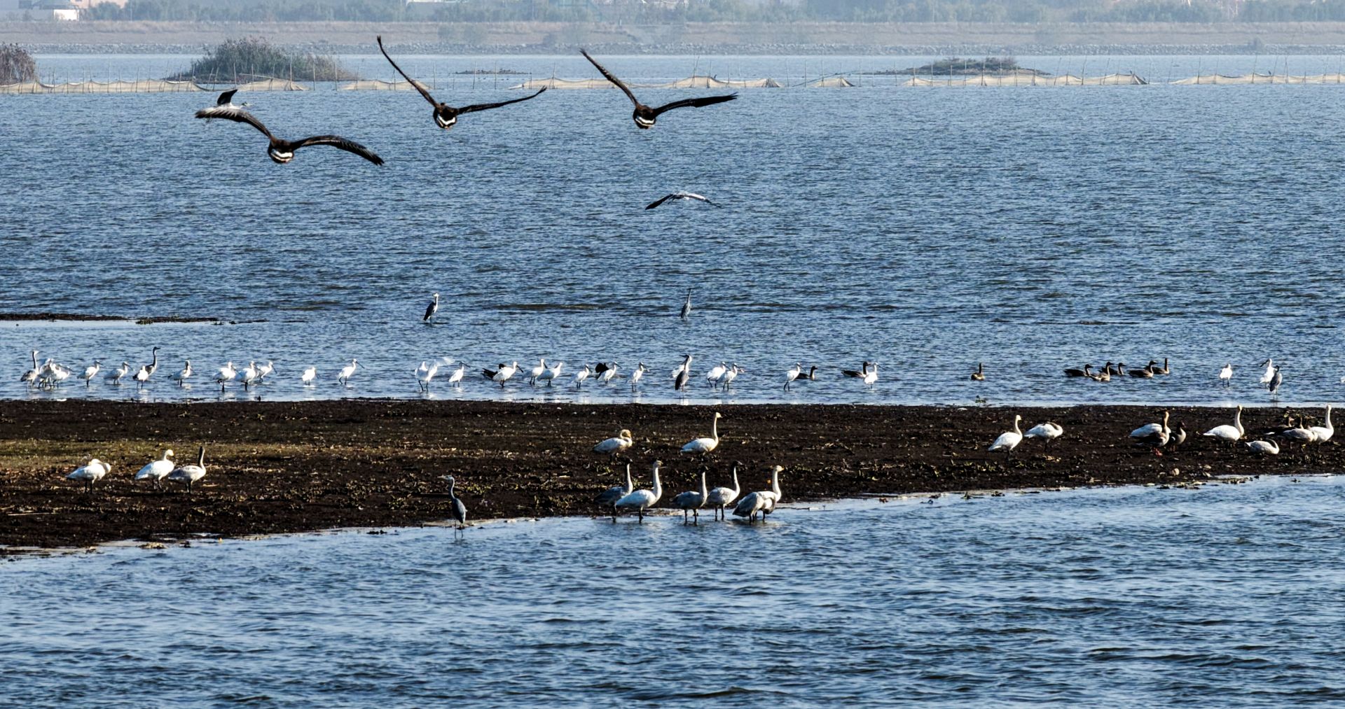 云上大冶报道(记者 石程曦 通讯员 宫少华)11月28日,记者在熊家洲垦区附近看到,大大小小的候鸟在此栖息。成群结队的候鸟或翱翔于水面上空,或漫游于水面之上,或驻足觅食,与天空水面交相辉映,构成一幅美妙的冬日画卷。据了解,来此栖息的候鸟有天鹅、大雁、白琵鹭等。