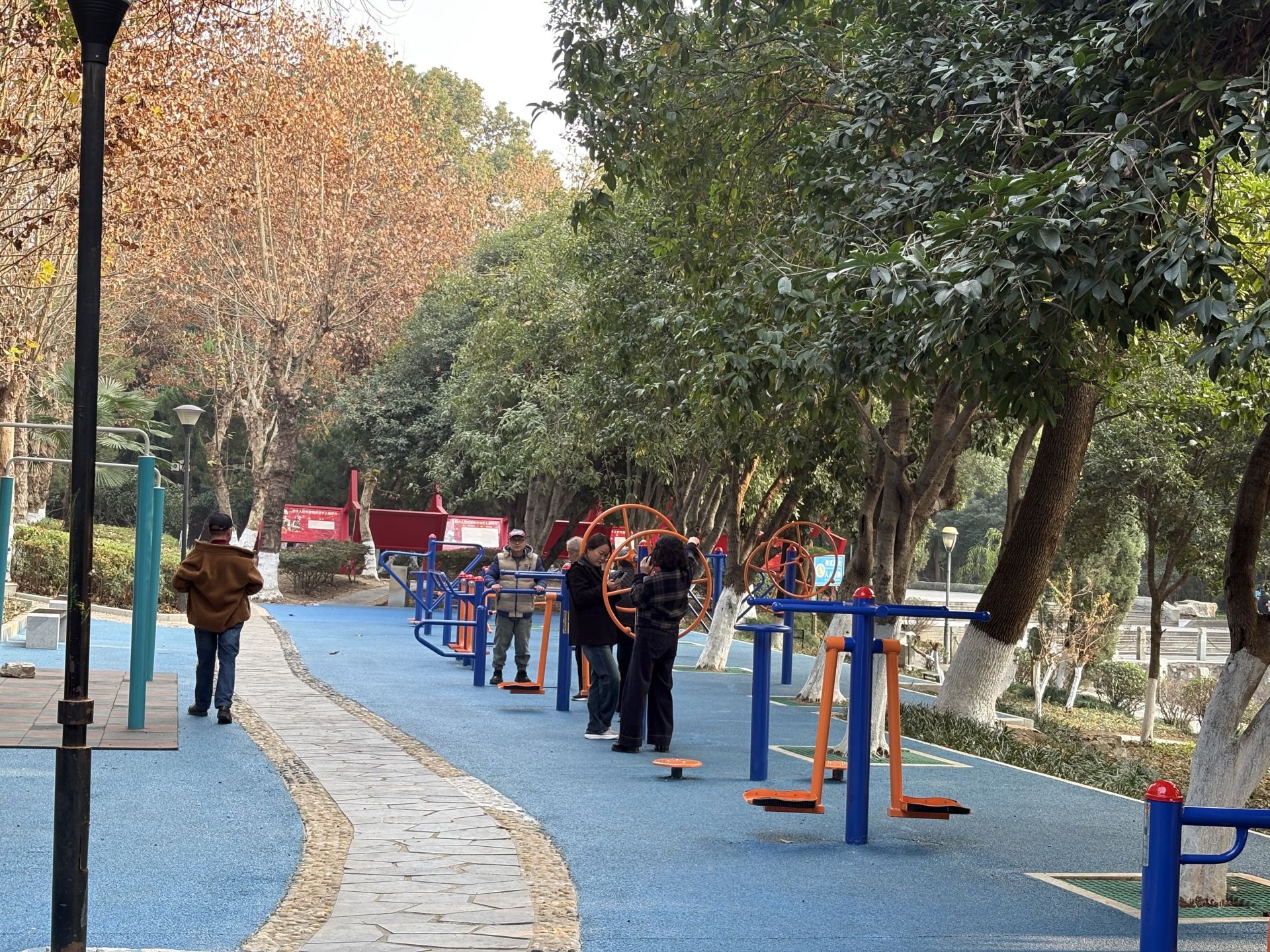 在青龙山公园,彩色步道蜿蜒穿梭于绿意之间,沿途健身器材区、休憩长廊布局规整,功能完备。园内随处可见悠闲休憩的市民,大家或沿步道漫游,沉浸式感受草木清香;或在健身器材上舒展筋骨,畅享运动乐趣,一派悠然自得、其乐融融的景象。