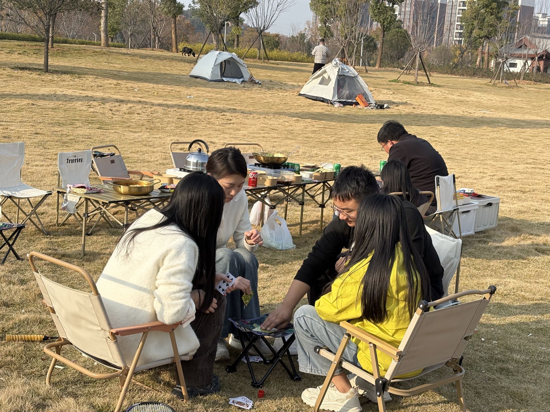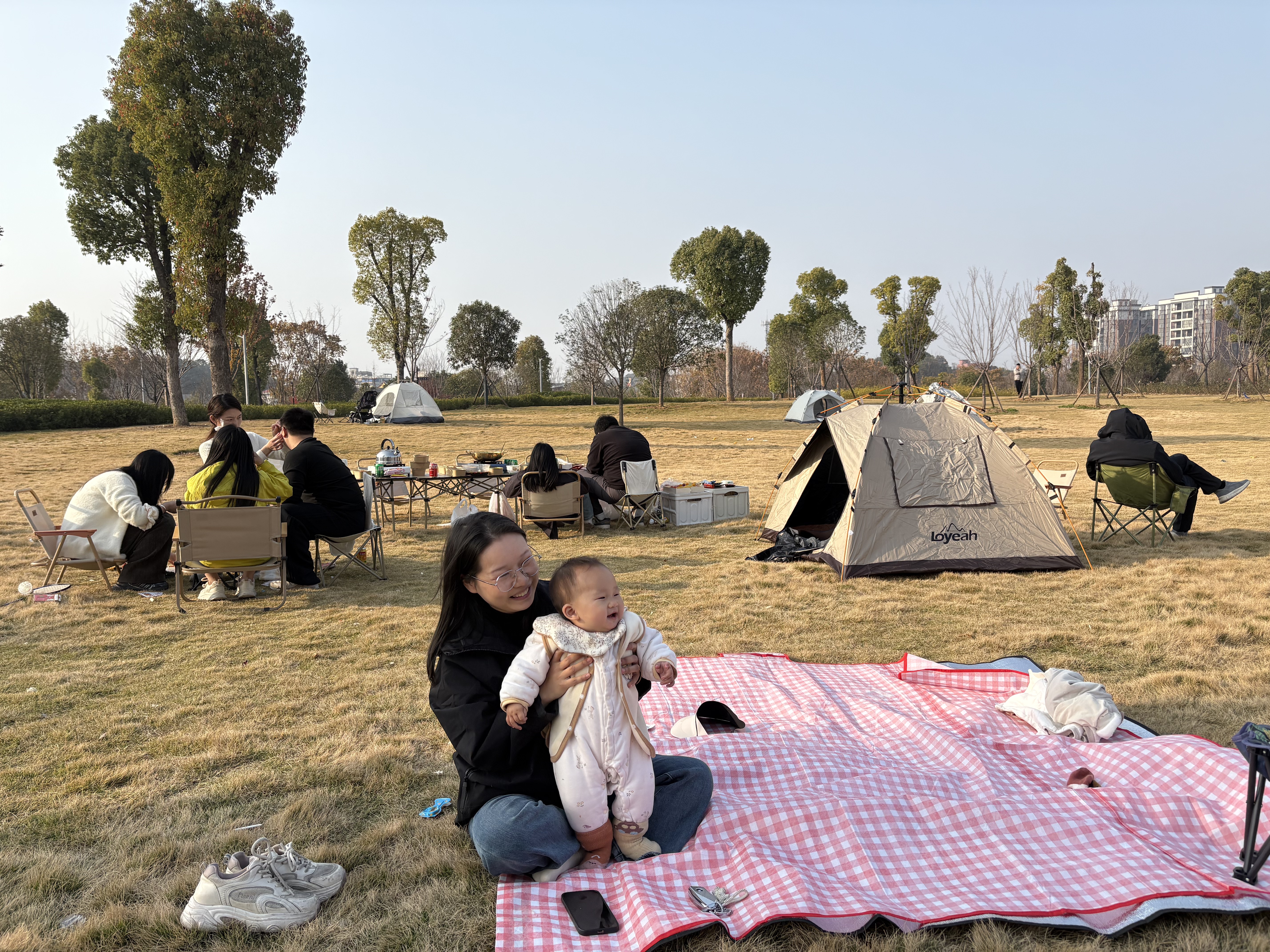 与青龙山公园的规整雅致不同,金湖生态园尽显开阔清新的生态韵味,勾勒出别样休闲图景。开阔的草坪上,不少家庭搭起帐篷、铺开餐垫,各色美食整齐摆放,家人围坐相伴,欢声笑语间尽显亲子时光的温馨;儿童游乐区内,孩子们追逐嬉戏、尽情玩耍,清脆的笑声回荡其间,满是活力与乐趣。
