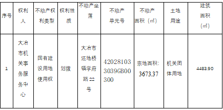 大冶市机关事务服务中心(还地桥财政所)位于大冶市还地桥镇学府路22号宗地,因办理不动产登记需要进行不动产权籍调查,根据《国土资源部关于做好不动产权籍调查工作的通知》(国土资发【2015】41号)、《地籍调查规程》(GB/T 42547-2023)、《自然资源部关于加快解决不动产登记若干历史遗留问题的通知》(自然资发[2021]1号文)、鄂自然资函【2020】390号文,现将该宗地不动产权籍调查结果予以公示,若相关邻宗地土地权属人对该宗地的公示情况有异议的,请自本公告之日起十五个工作日内将异议书面材料送达我中心。逾期无人提出异议或异议不成立的,我中心将按不动产权籍公告结果予以登记。