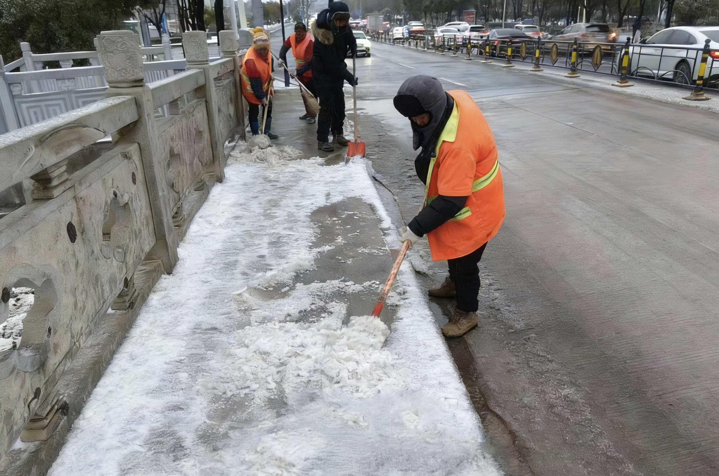 清晨6时许,天色未亮,长乐大道、罗金大道等园区主要进出口路段已是一派繁忙景象。执法人员与环卫工人采取“人工为主、机械配合”模式,对主次干道、桥梁、坡道等重点区域展开地毯式清理。并同步实施撒布融雪剂、铺设防滑草垫等融雪防冰措施,切实筑牢行人、车辆通行安全防线。