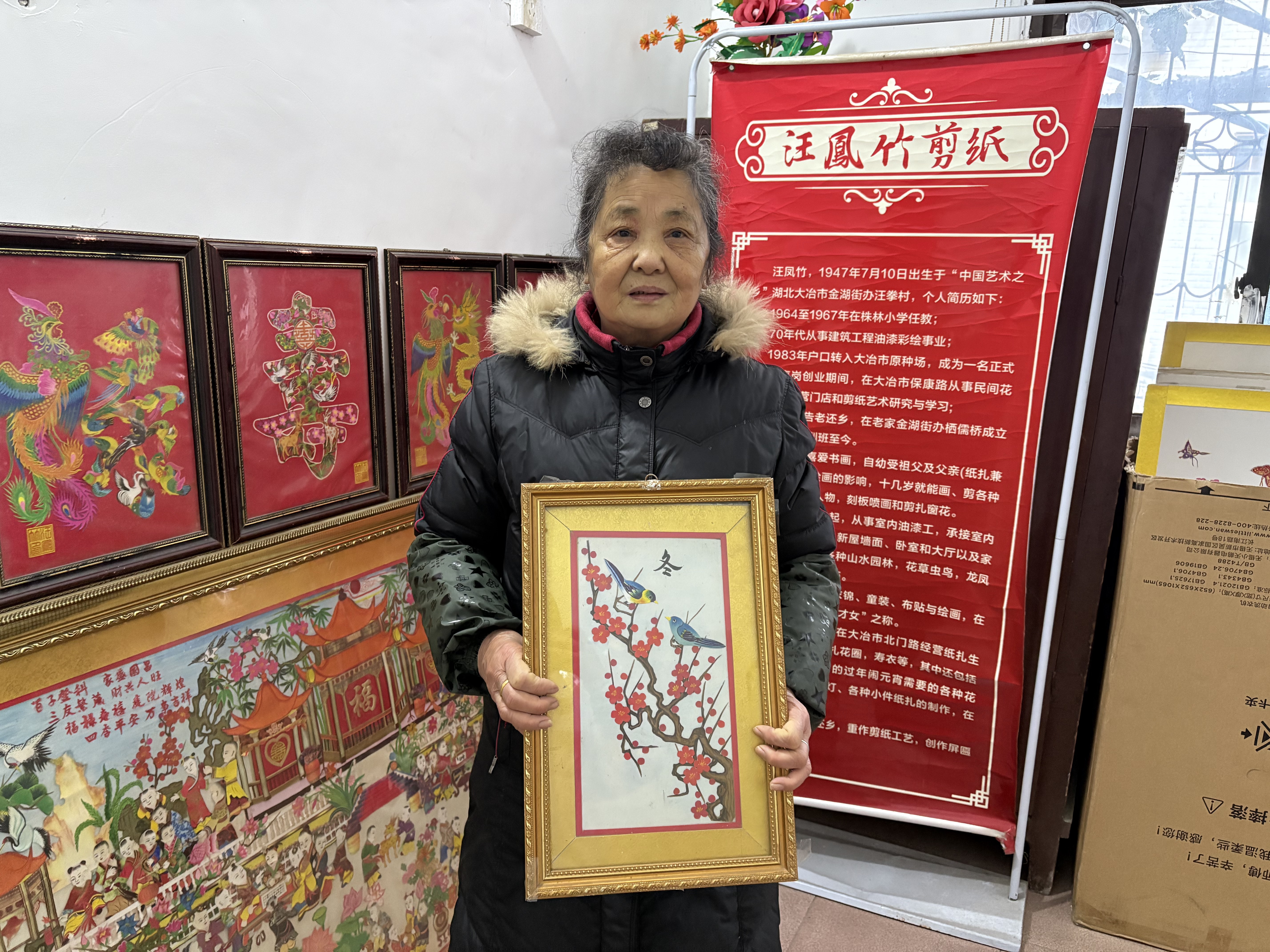 1月22日,记者走进汪凤竹位于伍家垅巷的居所,只见墙面、柜间陈列着大量精美剪纸,每一幅都凝聚着创作者的心血与热忱。
