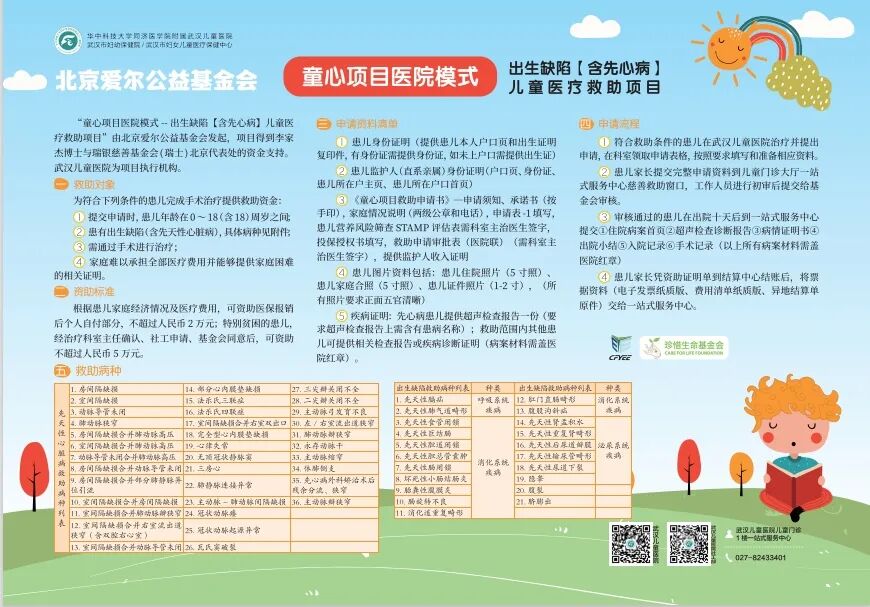 天使之旅-湖北先心病患儿筛查救助行动:室间隔缺损、房间隔缺损、动脉导管未闭、复杂先心病等先心病最高救助3万元;