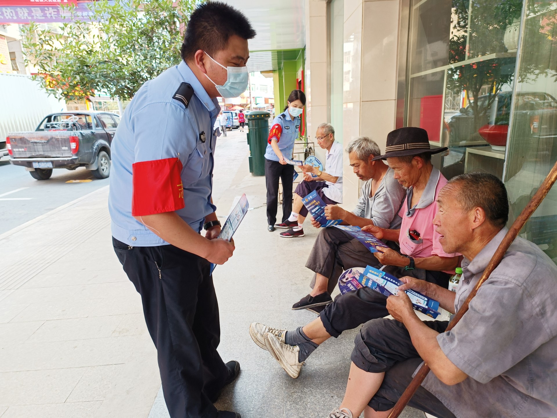 6月14日一早,殷祖派出所志愿者走近街面商铺边纳凉咵天的老年人身边,发放反诈宣传单,耐心地讲授防诈反诈知识。
