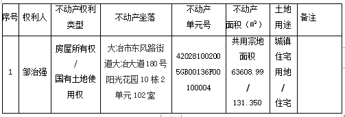 邹治强对坐落于大冶市东风路街道大冶大道180号阳光花园10栋2单元102室房屋申请登记,因开发商失联,现根据《不动产登记暂行条例》、《不动产登记暂行条例实施细则》、《不动产登记操作规范(试行)》之规定,我中心对该申请予以审查并予公告。如对所述内容有异议,请自本公告之日起十五个工作日内将异议书面材料送达大冶市不动产登记中心综合窗口。逾期无人提出异议或者异议不成立的,我机构将予以登记并颁发不动产权证书。
