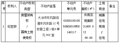 纪宏安对坐落于大冶市东风路街道东风东路12号安居工程1栋5单元902室房屋申请登记,因开发商失联,现根据《不动产登记暂行条例》、《不动产登记暂行条例实施细则》、《不动产登记操作规范(试行)》之规定,我中心对该申请予以审查并予公告。如对所述内容有异议,请自本公告之日起十五个工作日内将异议书面材料送达大冶市不动产登记中心综合窗口。逾期无人提出异议或者异议不成立的,我机构将予以登记并颁发不动产权证书。