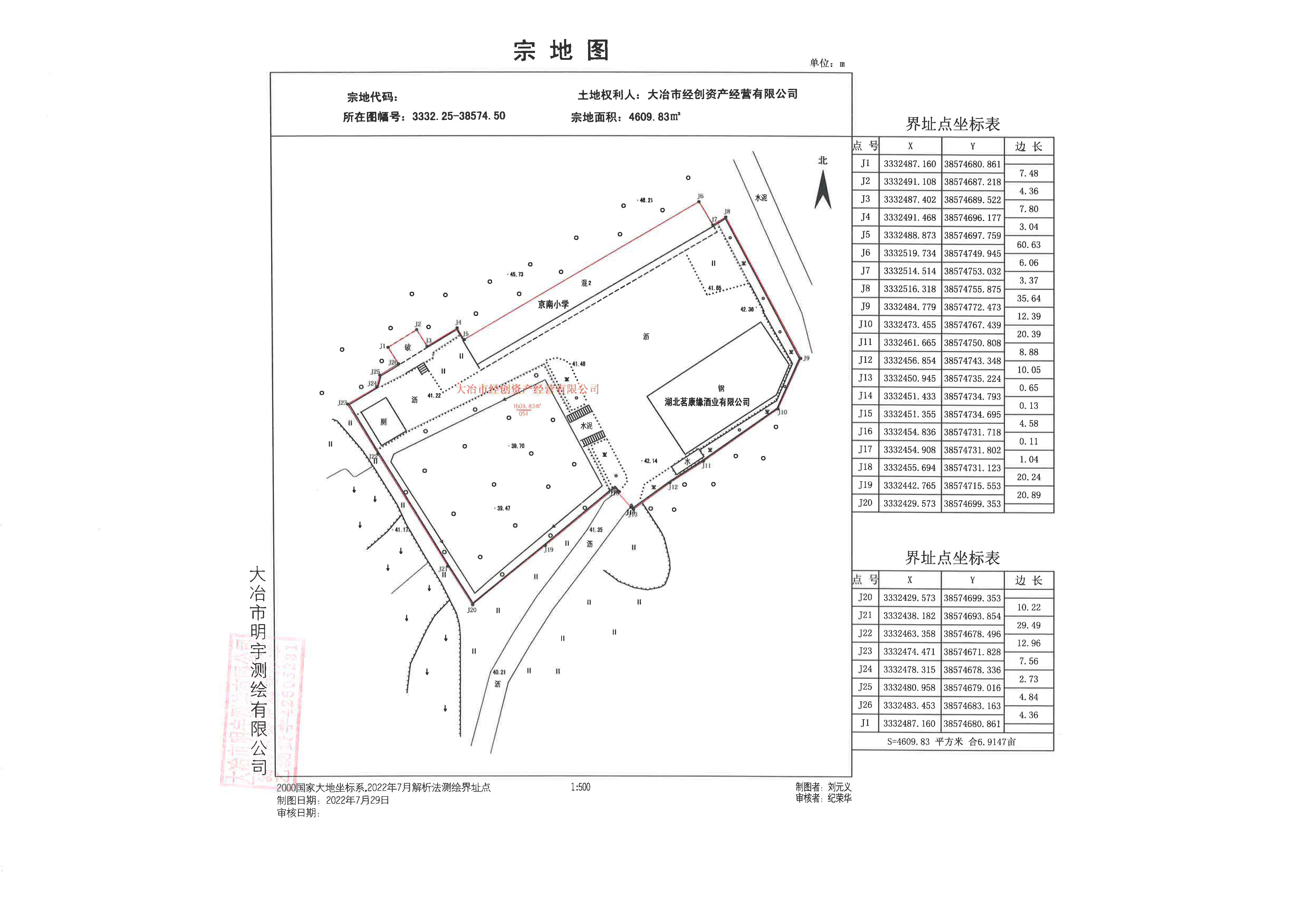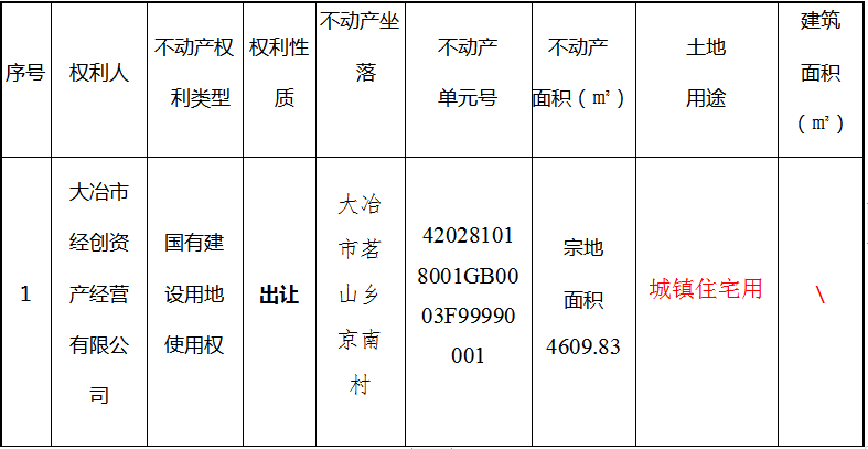 不动产权籍调查结果公告(2022)第522号 2022-10-18 16:09 0 大冶市经创资产经营有限公司位于大冶市茗山乡京南村京南小学,因办理不动产登记需要进行不动产权籍调查,根据《国土资源部关于做好不动产权籍调查工作的通知》(国土资发【2015】41号)、《地籍调查规程》(TD/T 1001-2012)、《自然资源部关于加快解决不动产登记若干历史遗留问题的通知》(自然资发[2021]1号文)、鄂自然资函【2020】390号文,及相关法律法规,现将该宗地不动产权籍调查结果予以公示,若相关邻宗地土地权属人对该宗地的公示情况有异议的,请自本公告之日起十五个工作日内将异议书面材料送达我中心。逾期无人提出异议或异议不成立的,我中心将按不动产权籍公告结果予以登记。 异议书面材料送达地址:大冶市长乐大道大冶市政务服务中心大楼二层市不动产登记中心 联系人:李劲松 联系电话:13986583927 附:大冶市茗山乡京南村京南小学宗地图 大冶市不动产登记中心 2022年10月13日