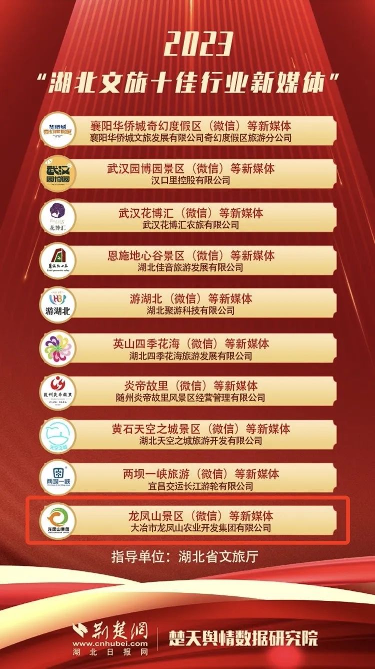 此外,本次评选特增设“2023湖北政法系统十佳新媒体主办单位评选”“湖北文旅系统十佳新媒体评选”,“龙凤山景区”微信公众号等新媒体(大冶市龙凤山农业开发集团有限公司)获评“2023湖北文旅十佳行业新媒体”。