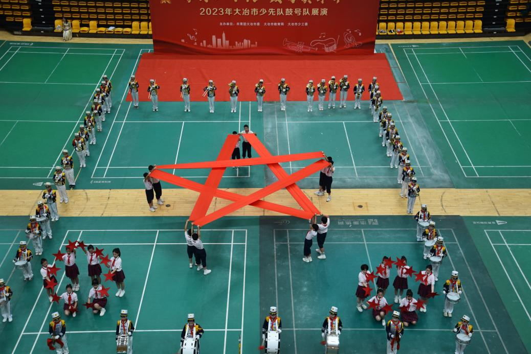 由团市委、市教育局和市少工委共同举办的“学习二十大鼓号奏华章”2023年大冶市少先队鼓号队展演活动在体育公园举行,来自全市的15支队伍参加比赛。比赛正式开始,参赛队伍依次进场,伴随着清脆的鼓点、整齐的步伐,五角星、红领巾等队形不断变换,场上气氛热烈,呐喊声响彻场馆,尽显朝气蓬勃的少年风采。经过一番激烈紧张的角逐,最终冶师附小鼓号队、实验小学鼓号队荣获特等奖。