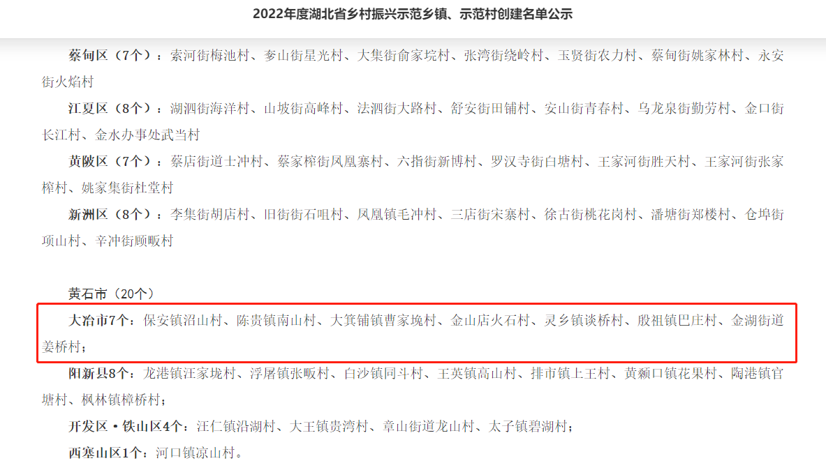 云上大冶报道(记者 李尚书)近日,湖北省农业农村厅、湖北省乡村振兴局公示了2022年全省乡村振兴示范乡镇、示范村创建名单,其中,我市保安镇入选湖北省乡村振兴示范乡镇创建名单,保安镇沼山村、陈贵镇南山村、大箕铺镇曹家晚村、金山店火石村、灵乡镇谈桥村、殷祖镇巴庄村、金湖街道姜桥村入选湖北省乡村振兴示范村创建名单。