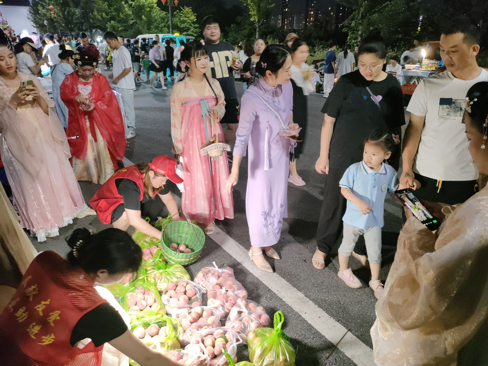 云上大冶报道(记者 尚甜甜)“又大又甜狗血桃,好吃好看有营养。新鲜的保安狗血桃,25元一袋,请大家过来支持一下我们本地的农户……”6月16日晚上八点,恒达欢乐大世界摩天轮旁,一群身穿汉服的小姐姐蹲在路面一边在直播间售卖桃子,一边吆喝吸引路人过来买。