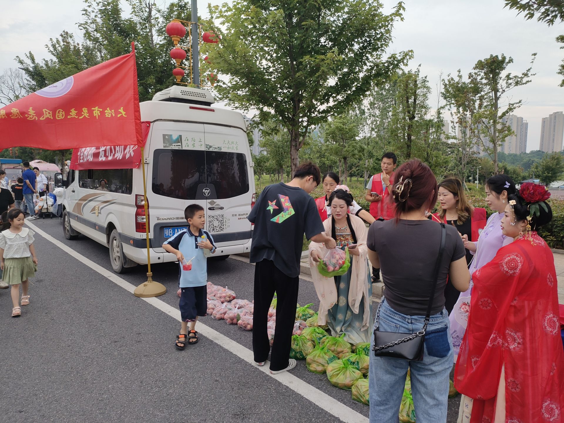 据了解,保安镇盘茶村今年狗血桃大丰收,现在正是收获季节,但受到近期阴雨天气等不利因素影响,该村种植的狗血桃遇到销售难题。盘茶村新时代文明实践站聚焦桃农眼前困难,通过向保安镇文明实践所和市文明实践中心点单,向全市爱心人士发出倡议,号召全市上下积极开展“‘桃’你喜欢 爱心助农”公益行动。大冶市灵杰国风志愿服务队接单后,充分发挥队伍国风汉服的社会吸引力,开展线上线下相结合的“守望相助 爱心助农”义卖活动。