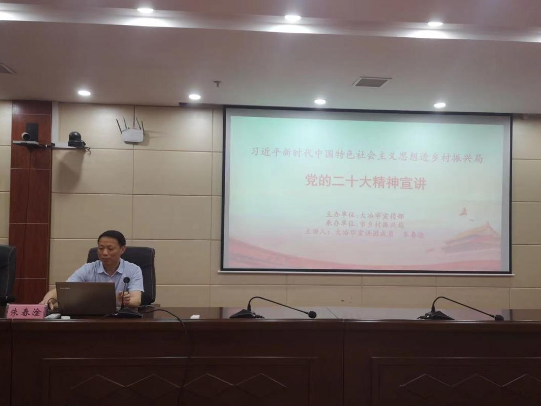 云上大冶报道(通讯员 黄河 记者 郑甜甜)6月7日下午,大冶市乡村振兴局举办党的二十大精神集中培训活动,共计30余人参加。大冶市委理论宣讲团成员朱春淦受邀以“习近平新时代中国特色社会主义思想”为主题,从党的十九大以来五年的工作和新时代十年的伟大变革,给党员干部讲了一堂生动的课。