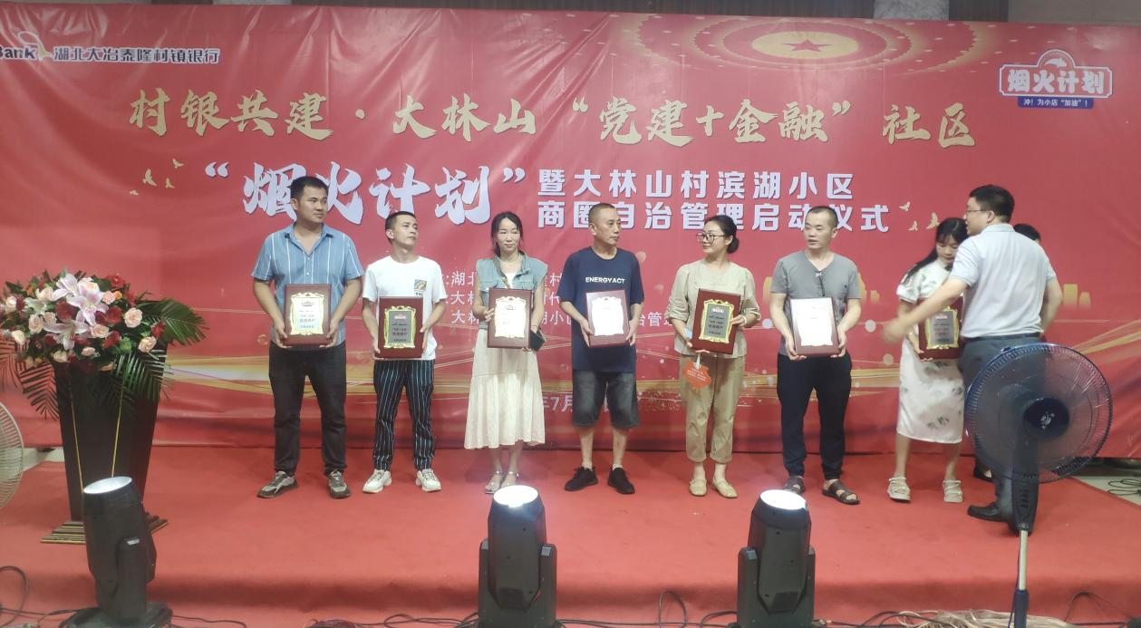 大林山村滨湖小区商圈自治管理委员会宣读了《商圈自治倡议书》,进行了整村授信、商户授信及颁发信用村居牌匾,聘任卫丹凤为大林山村金融服务专员。