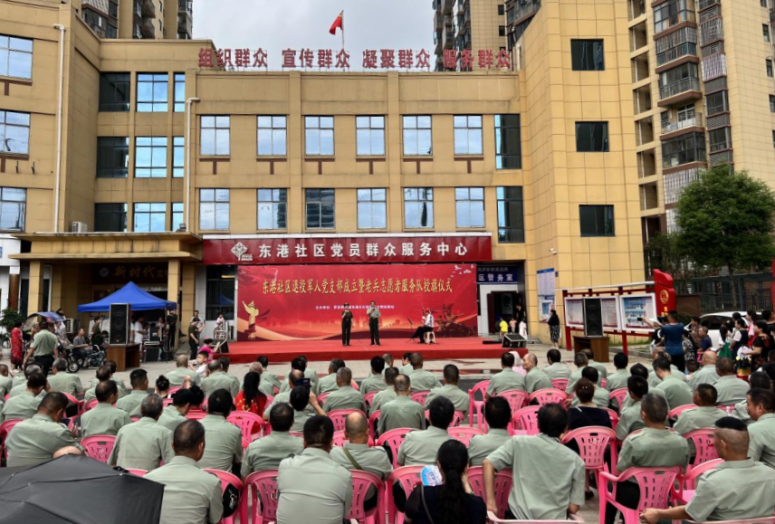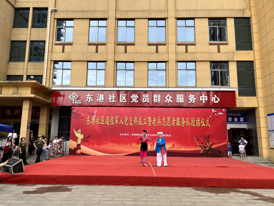 演出在锣鼓《红色娘子军》《天下第一鼓》表演中拉开帷幕,随后,东港社区副主任纪优宣读“东港社区退役军人党支部成立的通知”,并为东港社区新时代文明实践站“老兵志愿服务队”授旗。