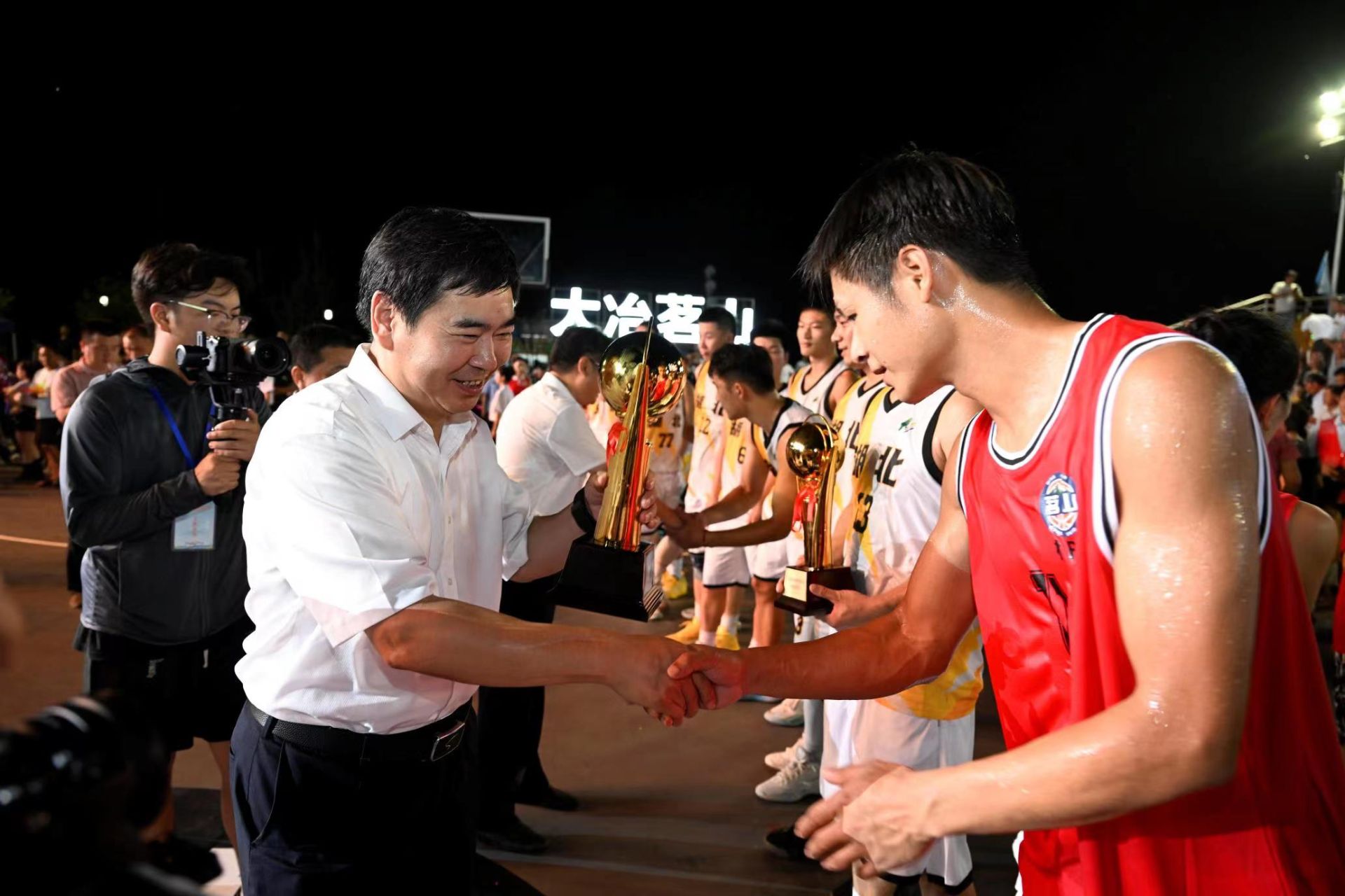 云上大冶报道(记者 周万榜)8月10日晚,“普及全民健身缔造幸福生活”湖北省和美乡村篮球大赛(村BA)启动仪式暨黄石市和美乡村篮球大赛(村BA)在茗山乡举行。省农业农村厅党组成员、副厅长陈志勇,省体育局党组成员、副局长骆启义,农业银行湖北省分行党委委员、副行长石俊功,黄石市委常委、大冶市委书记郝胜勇,黄石市委常委、市委宣传部部长周庆荣一同上台启动冰屏。