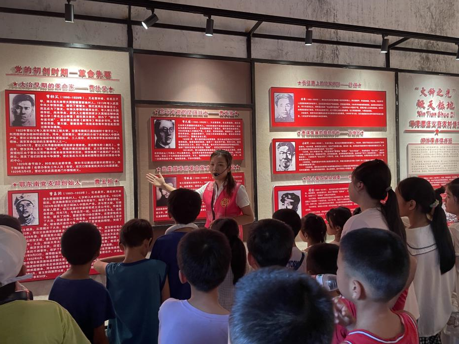 在鄂东南第一个农村党支部旧址,大箕铺镇巾帼宣讲员黄三青向孩子们宣讲革命先烈的英雄事迹,引导孩子们从小树立“童心向党”的信念,提高孩子们对大箕铺镇红色文化的了解。