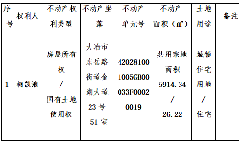 柯凯浪对坐落于大冶市东岳路街道金湖大道23号-51室号申请登记,未备案。现根据《不动产登记暂行条例》、《不动产登记暂行条例实施细则》、《不动产登记操作规范(试行)》之规定,对该申请予以审查并予公告。如对上述内容有异议,请自本公告之日起十五个工作日内将异议书面材料送达大冶市不动产登记中心综合窗口。逾期无人提出异议或者异议不成立的,我机构将予以登记并颁发不动产权证书。