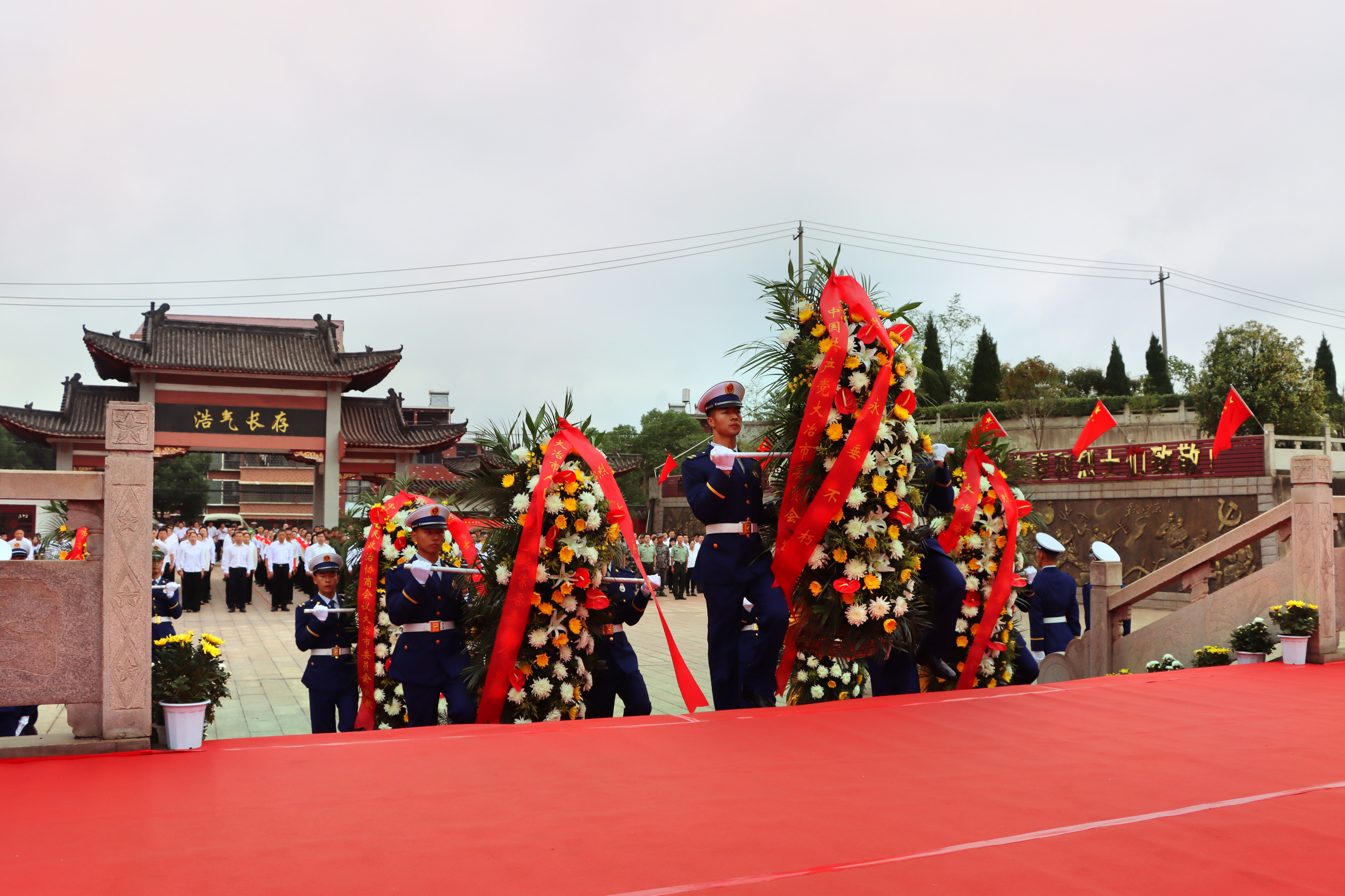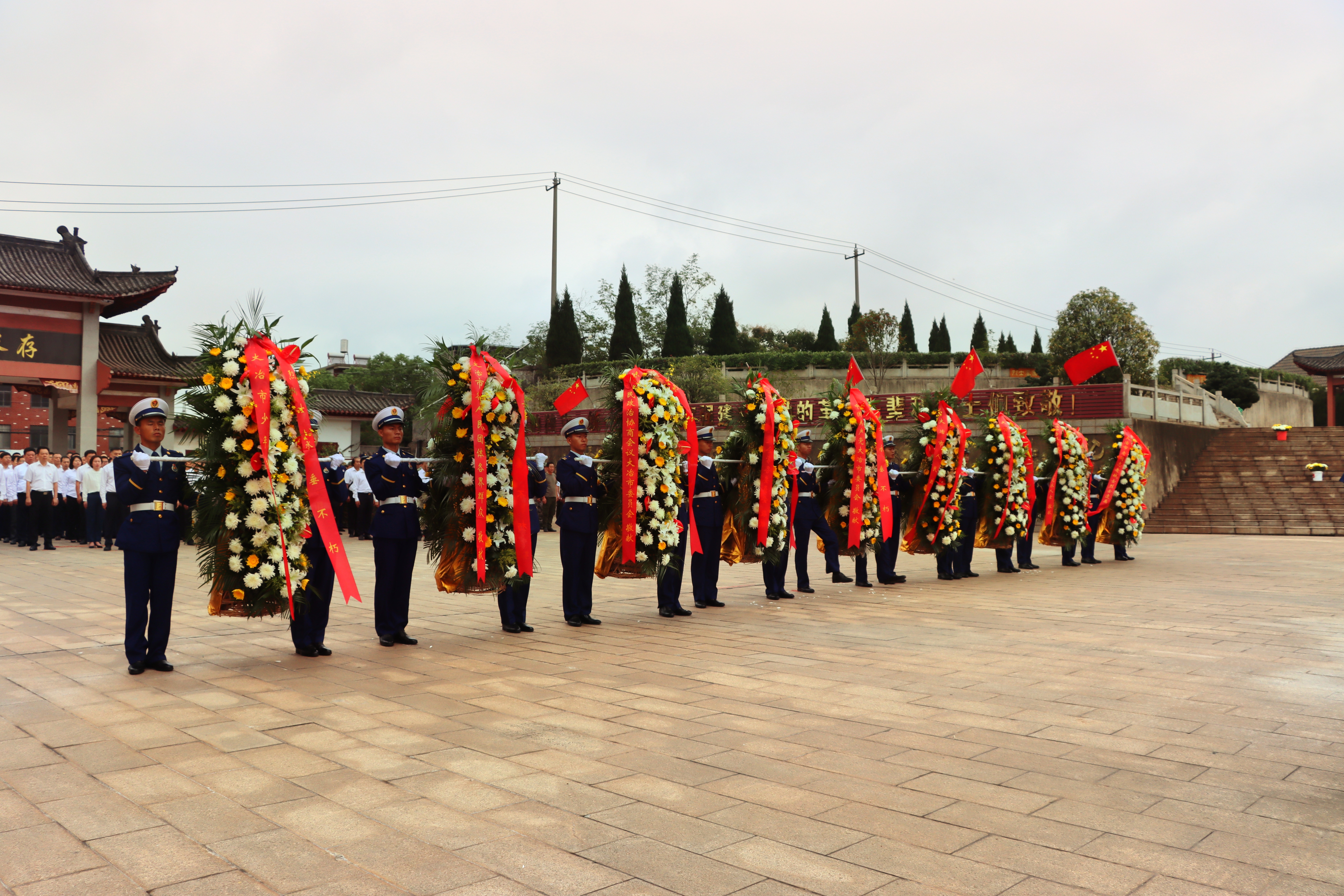 当天上午,大冶革命烈士陵园气氛庄严肃穆。烈士纪念碑巍然耸立,苍松翠柏环绕左右,绿植黄菊簇拥碑座。纪念碑前9个花篮一字排开,花篮红色缎带上“烈士永垂不朽”6个金色大字分外醒目。