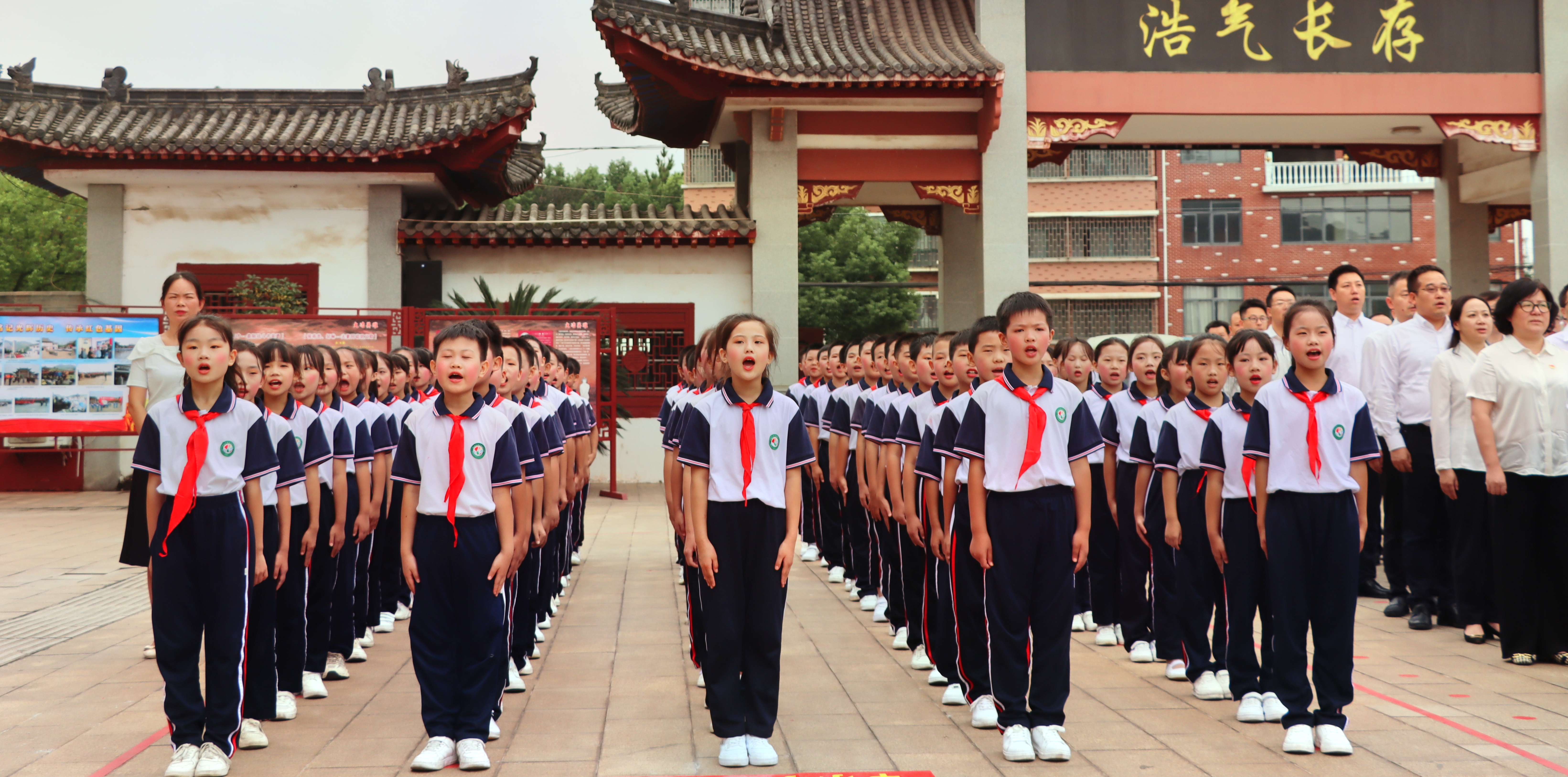 默哀毕,少先队员面向烈士纪念碑,献唱《我们是共产主义接班人》,行少年先锋队队礼。稚声嘹亮,队礼庄重。