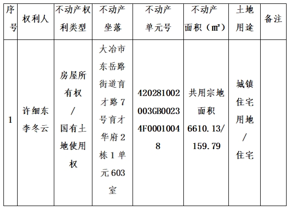 许细东、李冬云对坐落于大冶市东岳路街道育才路7号育才华府2栋1单元603室房屋申请登记,因开发商失联,无法在不动产登记申请书中申请人(义务人)栏签章,现根据《不动产登记暂行条例》、《不动产登记暂行条例实施细则》、《不动产登记操作规范(试行)》之规定,我中心对该申请予以审查并予公告。如对所述内容有异议,请自本公告之日起十五个工作日内将异议书面材料送达大冶市不动产登记中心综合窗口。逾期无人提出异议或者异议不成立的,我机构将予以登记并颁发不动产权证书。