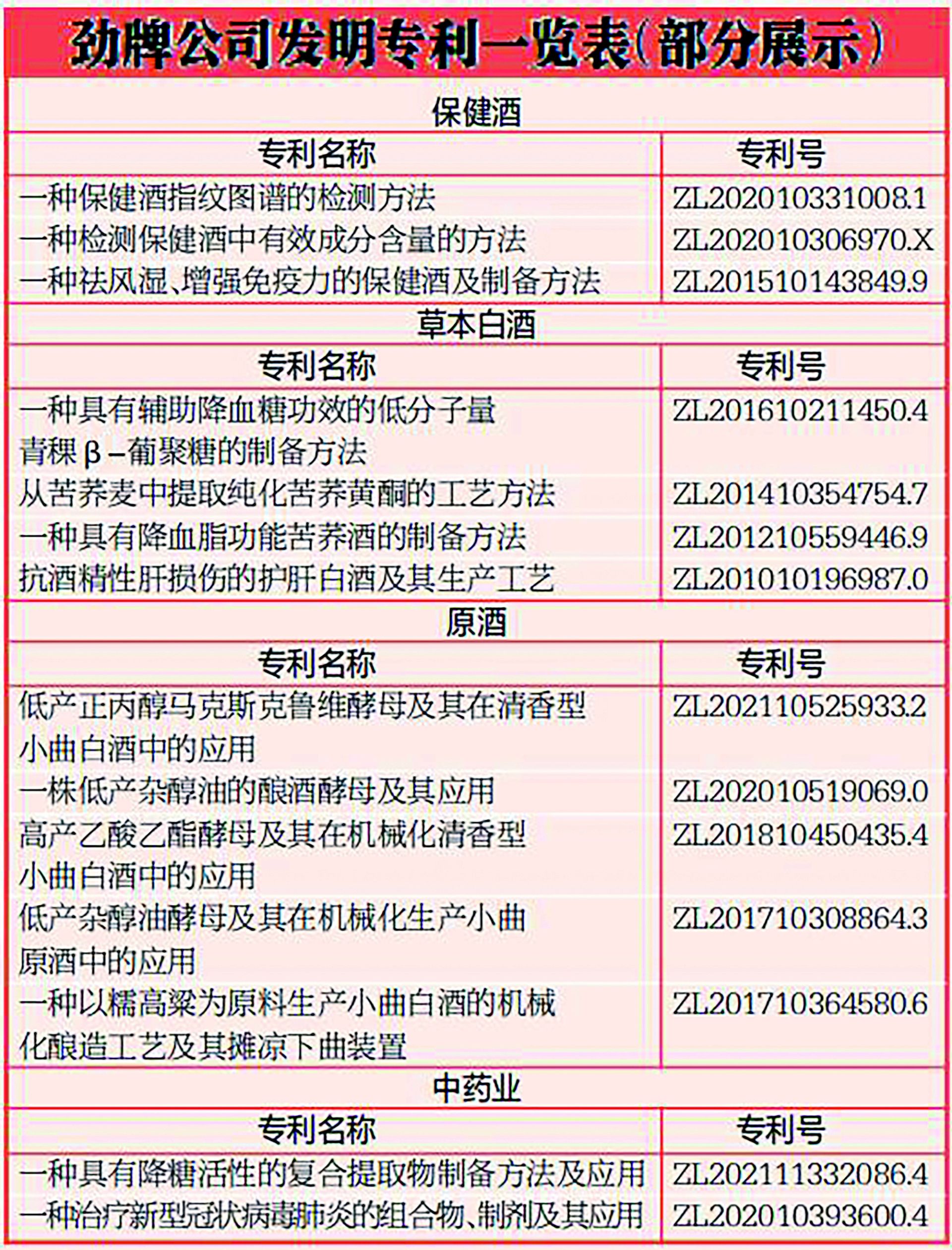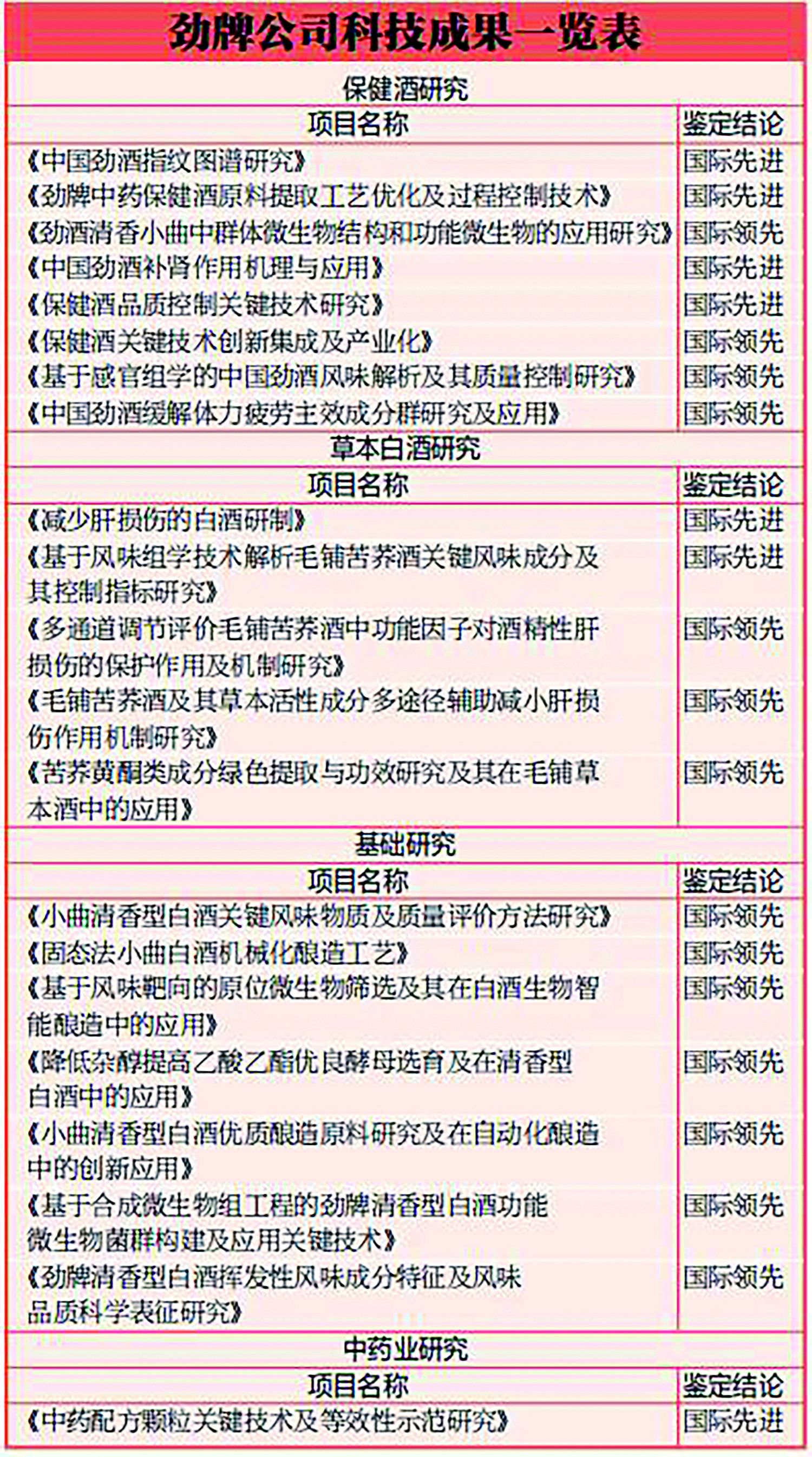 截至目前,劲牌共有21项科技成果被鉴定为达到“国际领先(先进)水平”,拥有110项国家授权发明专利,获得国家级、省部级以上科技进步奖21项。