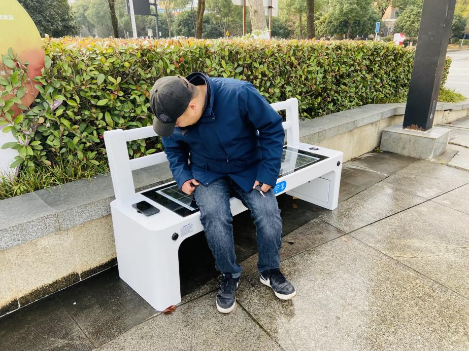 市民在智慧座椅上给手机充电