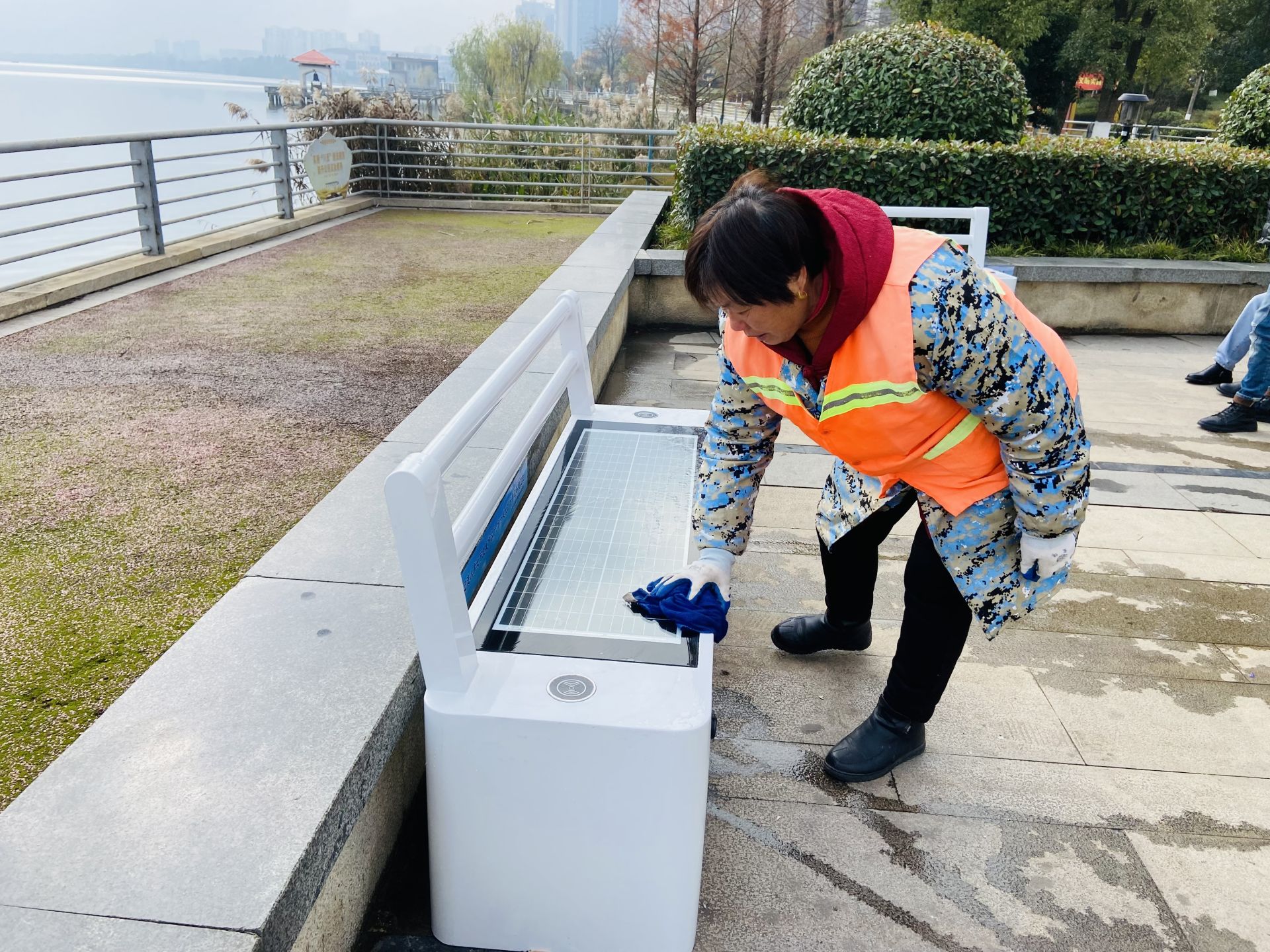 环卫工人正在擦拭智慧座椅