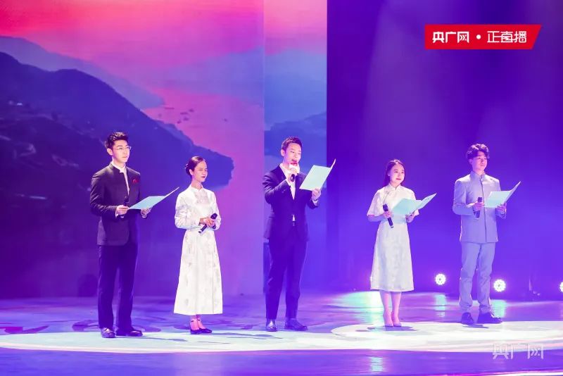 颁奖典礼现场演出形式丰富多样,民乐经典演奏《龙船调》、经典诗画音武《云依武当》为诵读的舞台带来了奇妙的意蕴;中央广播电视总台主持人商亮、王誉博,以及青年朗诵艺术家董丽娜,带领“中华经典诵读大会”(第一季)获奖的优秀选手代表,共同诵读关于长江文明的经典作品《长江》,更让现场观众得以重温经典文化中珍贵而独特的内涵。