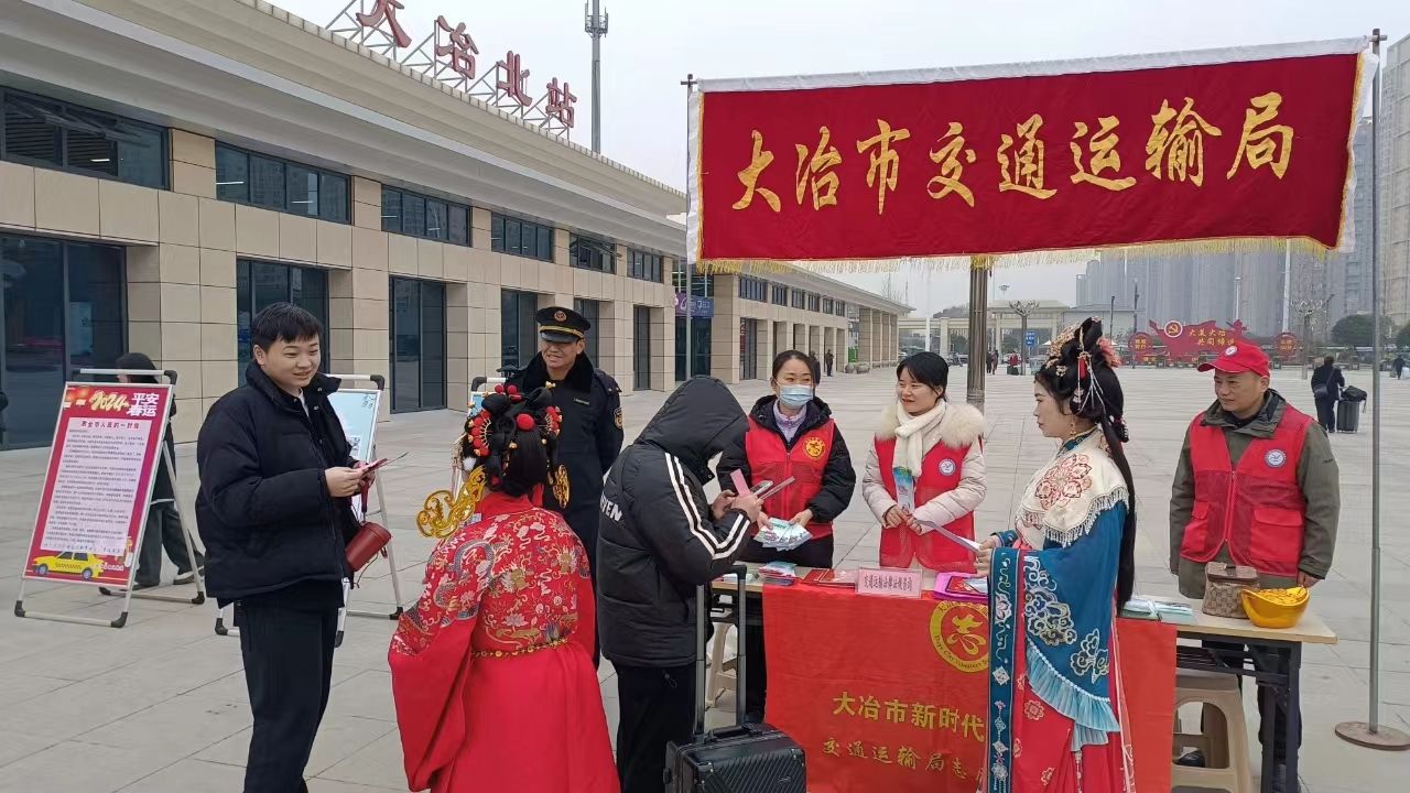 在大冶北站的出站口,市交通运输局设置“金龙迎春”“青铜故里大冶欢迎您”等展示栏,并有身穿国风服装的志愿者在门口迎接归家的游子,向他们讲解交通出行和货物运输的相关法律知识。