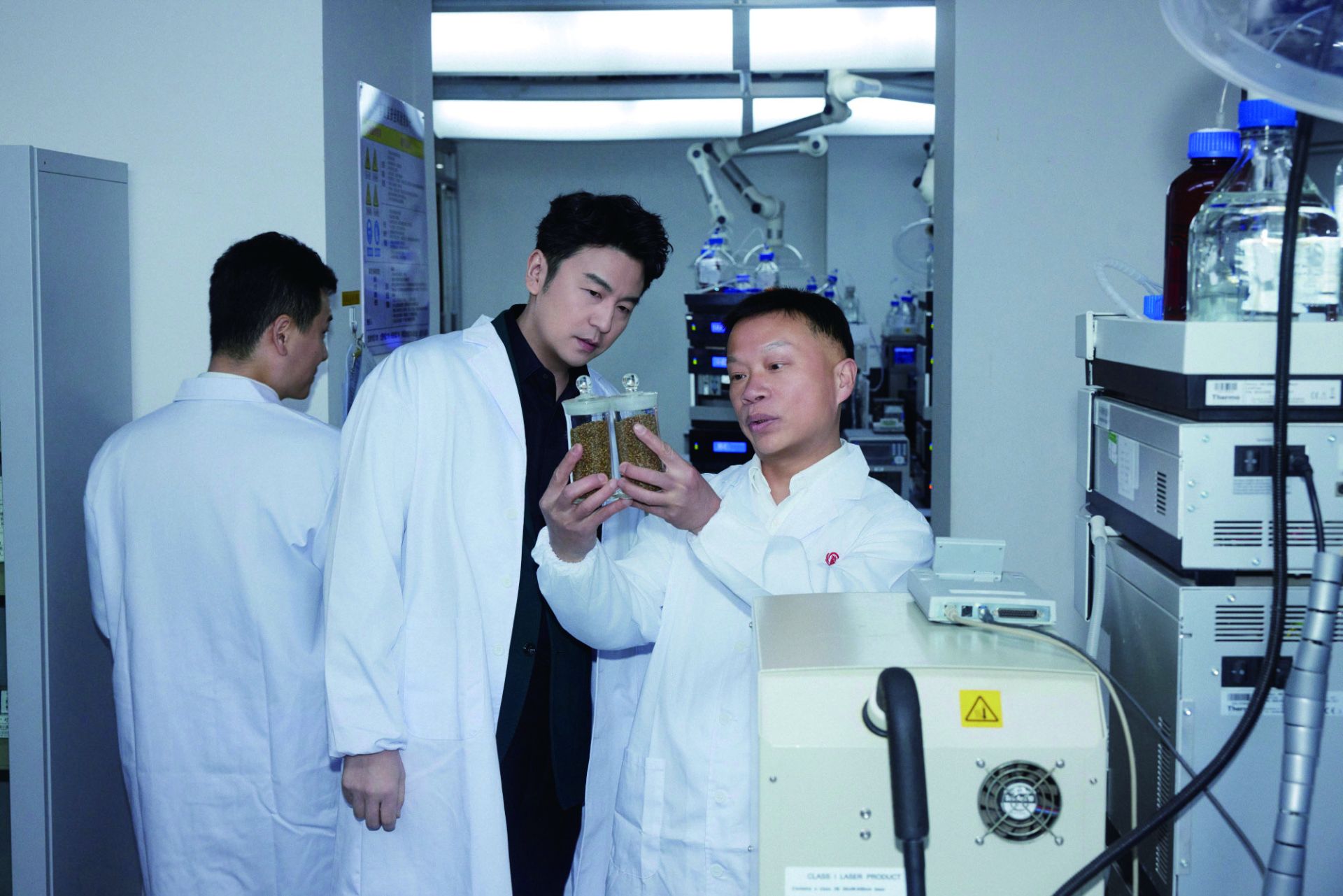 在劲牌公司白酒技术部部长童国强和研发人员的带领下,雷佳音现场辨识苦荞麦、葛根、枸杞子、桑叶以及针叶樱桃果五味草本和草本提取液,并且进入实验室参观草本是如何进行品质甄选和有效科学提取活性物质。