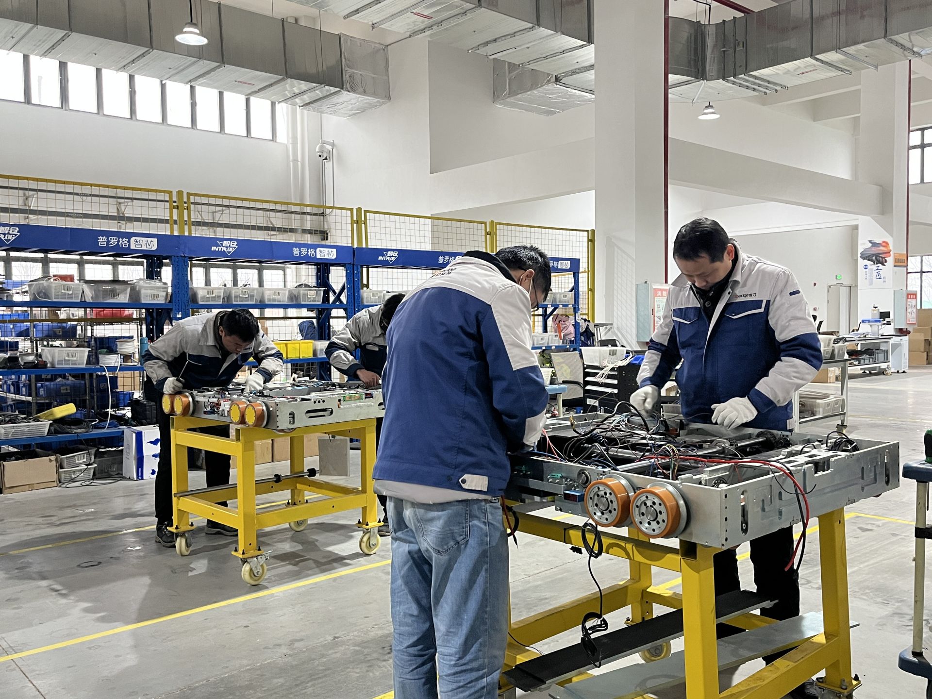 走进组装车间,十余名装配工程师正在紧锣密鼓地组装货架机器人,不远处的调试区,数个重载托盘四向机器人和全向式货箱机器人灵巧地忙碌穿梭。 智芯科技行政总监倪康俊介绍道 ,公司的订单已经排到了年后,目前正在赶制的是格力、京东等企业的订单。为了能够保质保量完成订单任务,春节假期组装车间是不休息的,坚持生产。