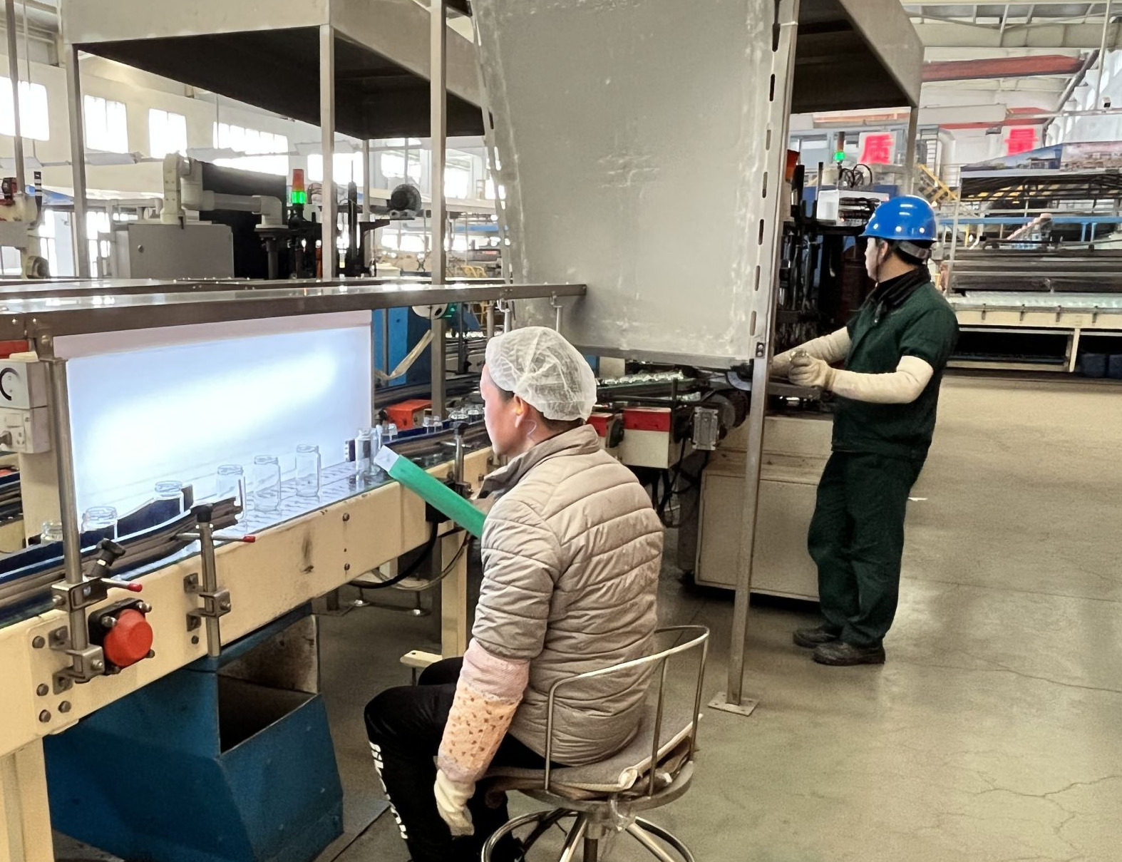 2月11日,记者走进大冶华兴玻璃有限公司生产车间,生产线上,高温熔化的玻璃水凝固成型,变成了一件件的精美的玻璃制品,再经过热喷、冷却等工艺,印有图文的成品,就可以检测、打包,转运到库房存放,每天,数以千万计的日用玻璃瓶都从这里“新鲜”出炉。
