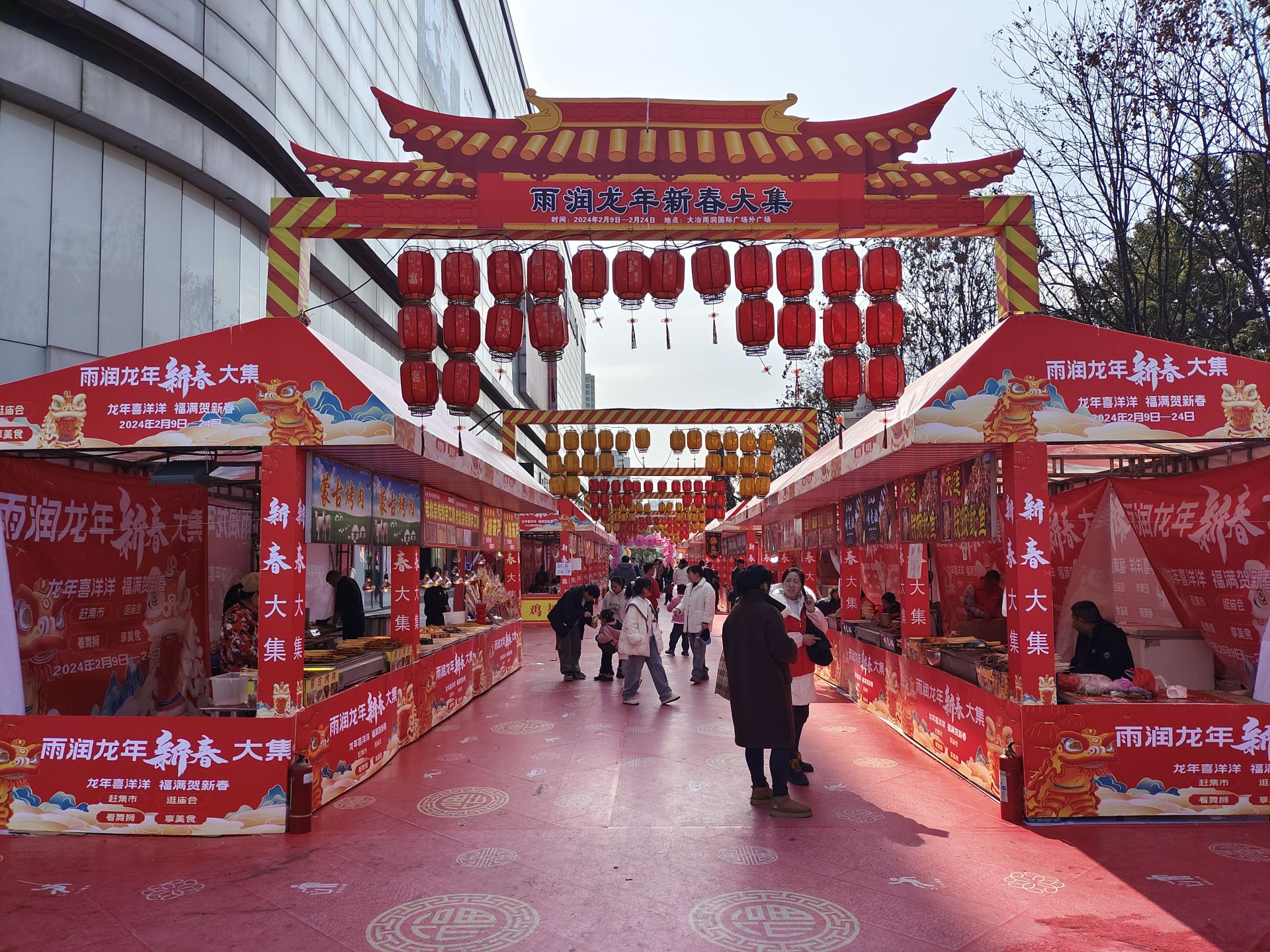 2月12日上午,记者走进雨润龙年新春大集现场,一个方正大气的红色门楼耸立,数百个大红灯笼悬挂上空,一抬头就是热热闹闹的喜庆氛围,吸引众多市民参与。走在美食街,红色彩绘包裹的摊位整齐排列,各种刚刚出炉的特色小吃冒着热气,游玩的市民兴致勃勃,纷纷驻足品尝和购买。