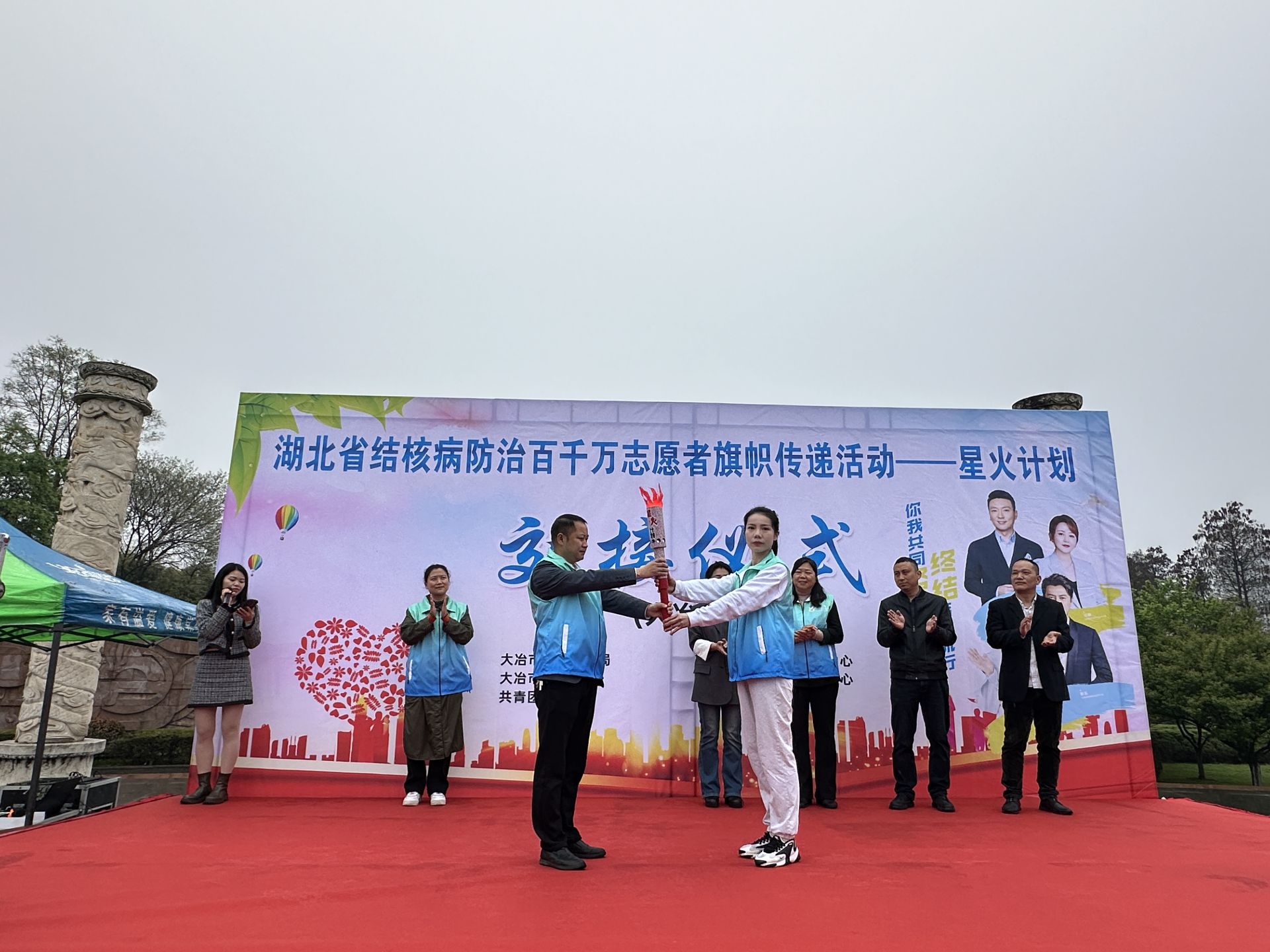 活动由市疾病预防控制局、市疾病预防控制中心主办,现场集结了来自市人民医院、团市委、尹家湖卫生服务中心的结核病防治志愿者,他们从黄石志愿队代表手上接过“星火计划”旗帜和火炬。