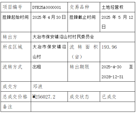 大冶市保安镇沼山村刘通畈湾土地承包经营权承租结果公告