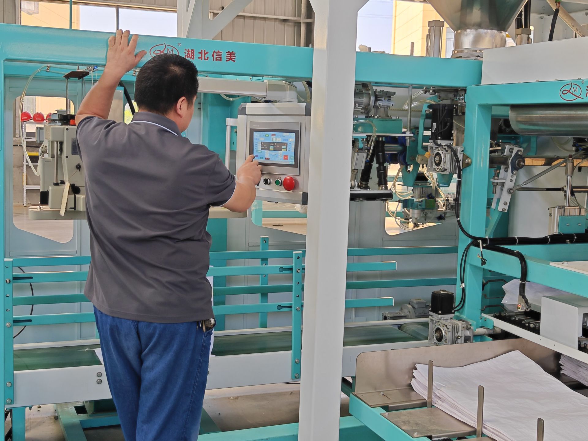 云上大冶报道(通讯员 李尚书)5月12日,在湖北信美智能设备有限公司(以下简称“信美智能”)车间,价值170多万元的粉体全自动抽气式包装机正快速运转,包装袋从袋仓经过上袋装置,由机械手抓举至称重口,自动进行抽气、称重,称重完成后再通过机械手移至封口端,自动完成封口。
