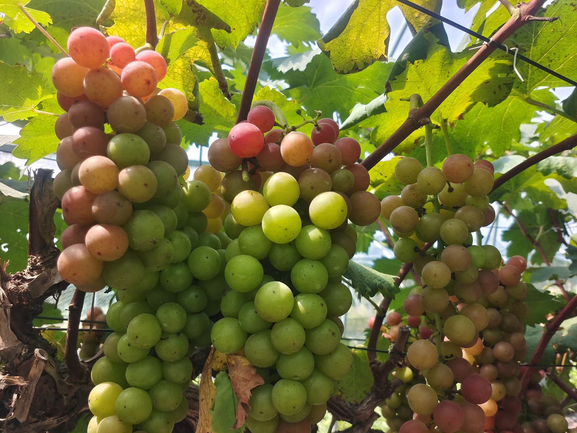同镇的刘家畈村陈斗生态园同样葡萄飘香。园内挂满红绿相间、形状各异的果实,随手摘一颗,满口香甜。园主陈斗介绍,园里有黑珍珠、阳光玫瑰、马奶、金手指等20多个品种,目前6种已上市,采摘期可持续至10月。