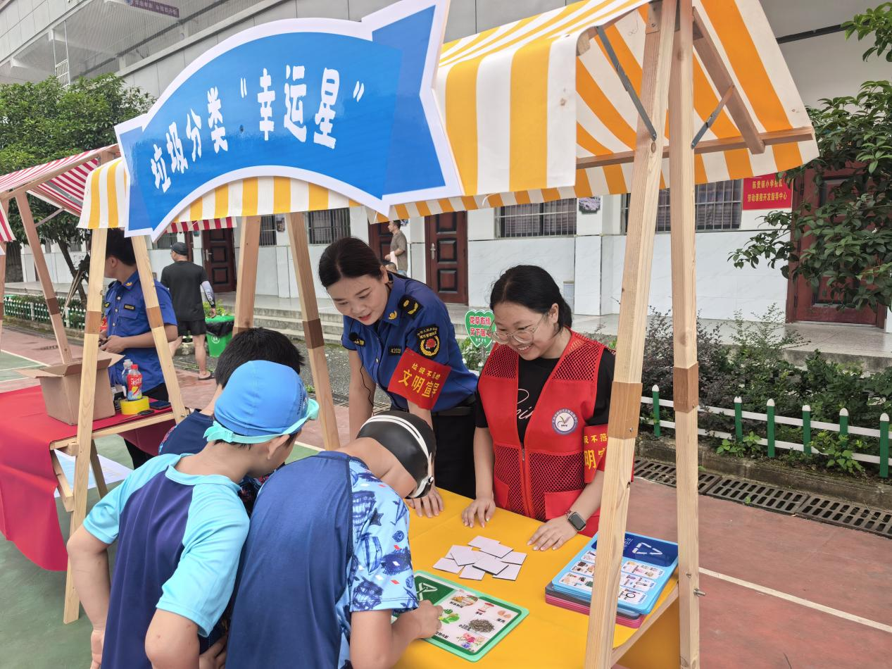 云上大冶报道(记者 熊业欣 通讯员 石婧)近日,一场别开生面的“碧水安澜防溺水·童心分类树新风”文明集市活动在陈贵镇中心小学火热开启。活动由陈贵镇新时代文明实践所、镇综合执法中心主办,镇中心学校、镇社会事务办、镇平安建设办、镇关工委、镇团委等多部门联合承办,为孩子们带来一堂集安全教育与文明实践于一体的“暑期必修课”。