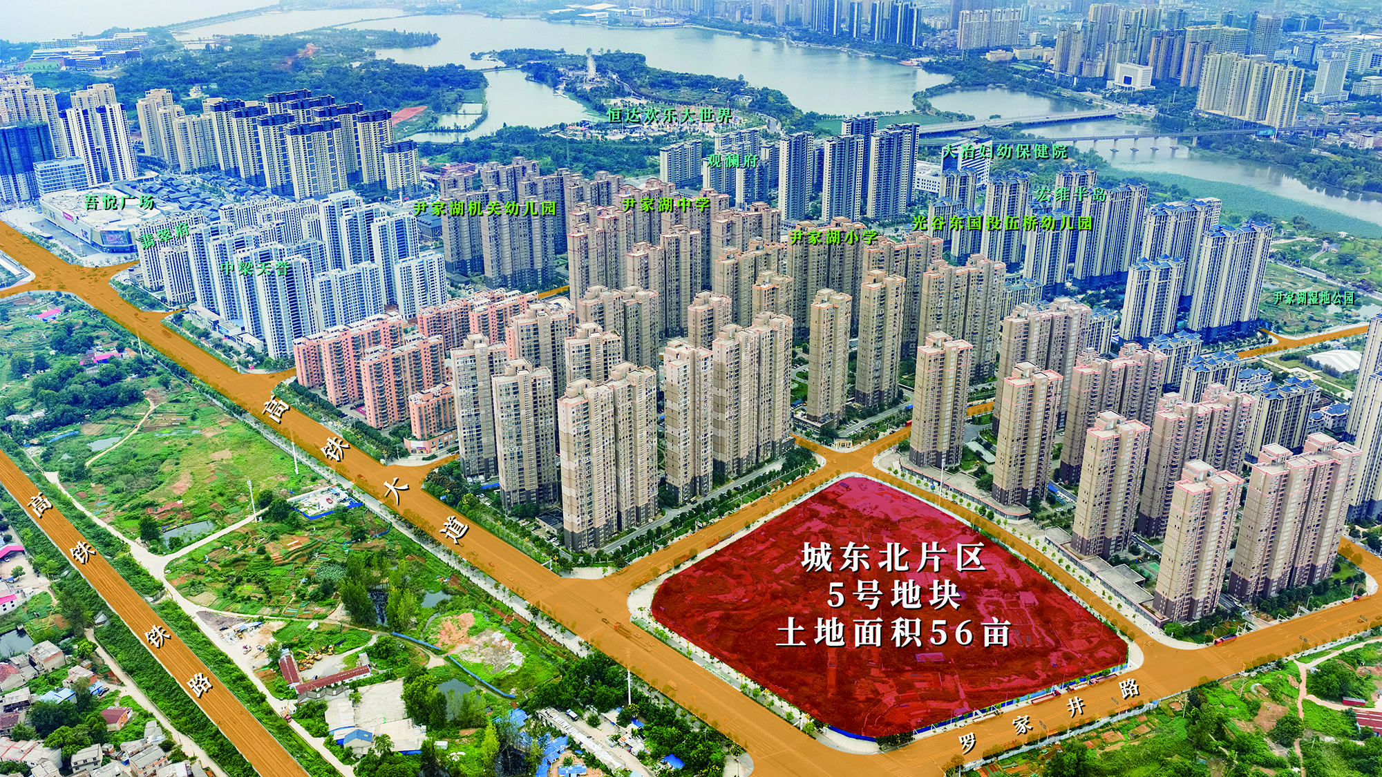 5号地块位于罗家井路南侧、高铁大道西侧,规划出让土地面积56亩。