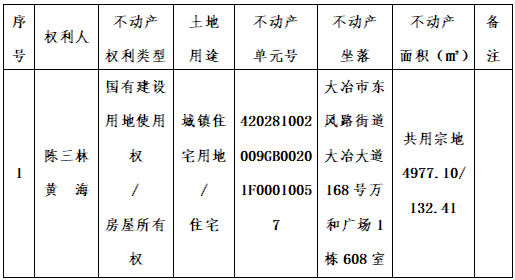 陈三林、黄海对坐落于大冶市东风路街道大冶大道168号万和广场1栋608室,申请转移登记(继承),现根据《不动产登记暂行条例》、《不动产登记暂行条例实施细则》、《不动产登记操作规范(试行)》之规定,对该申请予以审查并予公告。如对上述内容有异议,请自本公告之日起十五个工作日内将异议书面材料送达大冶市不动产登记中心。逾期无人提出异议或者异议不成立的,我机构将予以登记并颁发不动产权证书。
