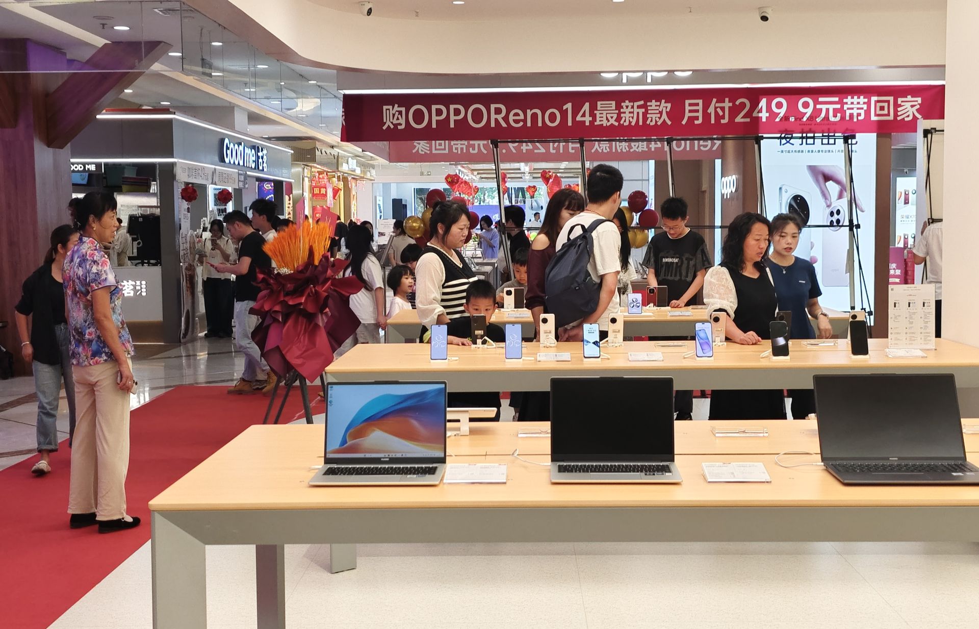 10月1日10点半,雨润商场华为体验授权店门口,消费者正围拢体验新款折叠屏手机。“早上9点半就有顾客排队,一小时就成交了8台,超出预期!”销售经理袁涛介绍,“我们特别设置了互动打卡区,吸引了不少家庭客群带孩子来体验。”